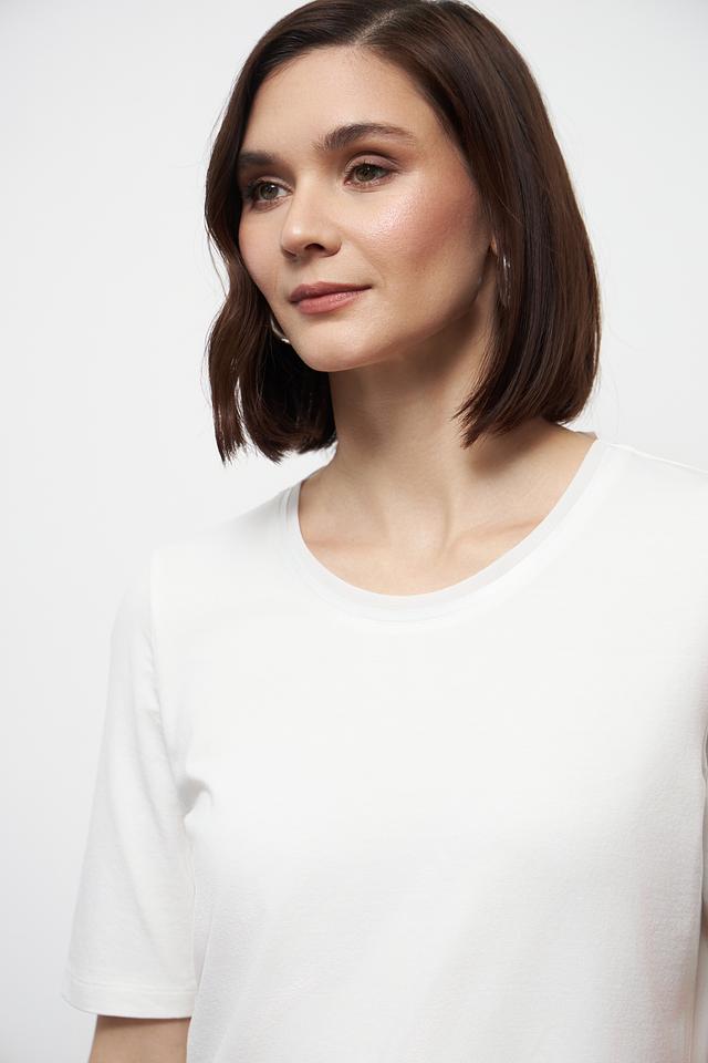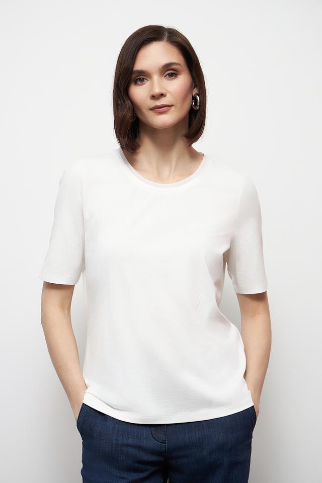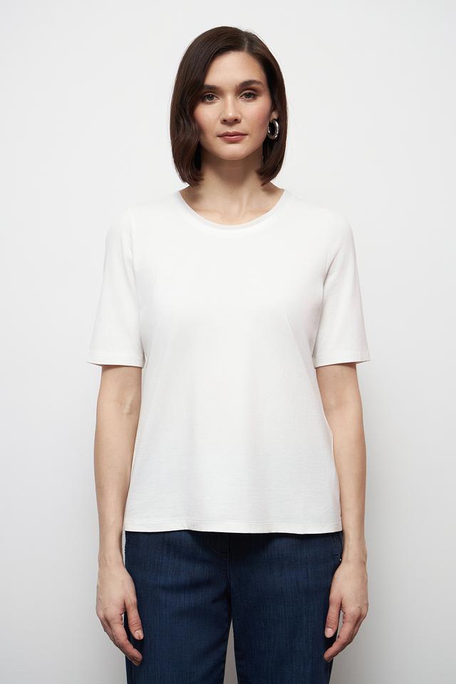 Круглый вырез горловины и короткие рукава делают футболку идеальной для теплой погоды. Простой, но элегантный дизайн позволяет носить ее как самостоятельно, так и в качестве базового слоя под жакет или кардиган.