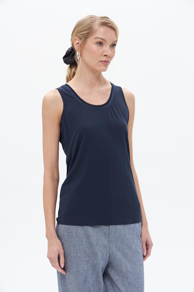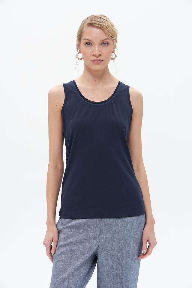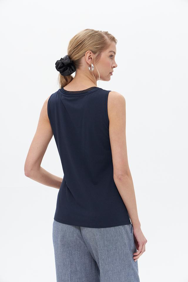 Топ имеет прямой крой и круглый вырез горловины. Отсутствие рукавов делает его идеальным выбором для теплой погоды. Ткань, состоящая из хлопка, модала и эластана, обеспечивает комфорт при носке и приятные тактильные ощущения.