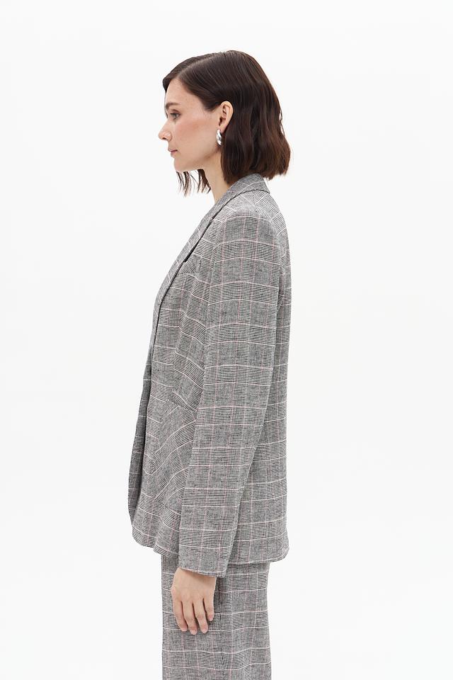 Изготовленный из смесовой ткани, состоящей из 53% льна, 45% вискозы и 2% эластана, жакет сочетает в себе комфорт и практичность. Лен обеспечивает воздухопроницаемость, вискоза – мягкость и приятные тактильные ощущения, а эластан – небольшую эластичность для свободы движений.