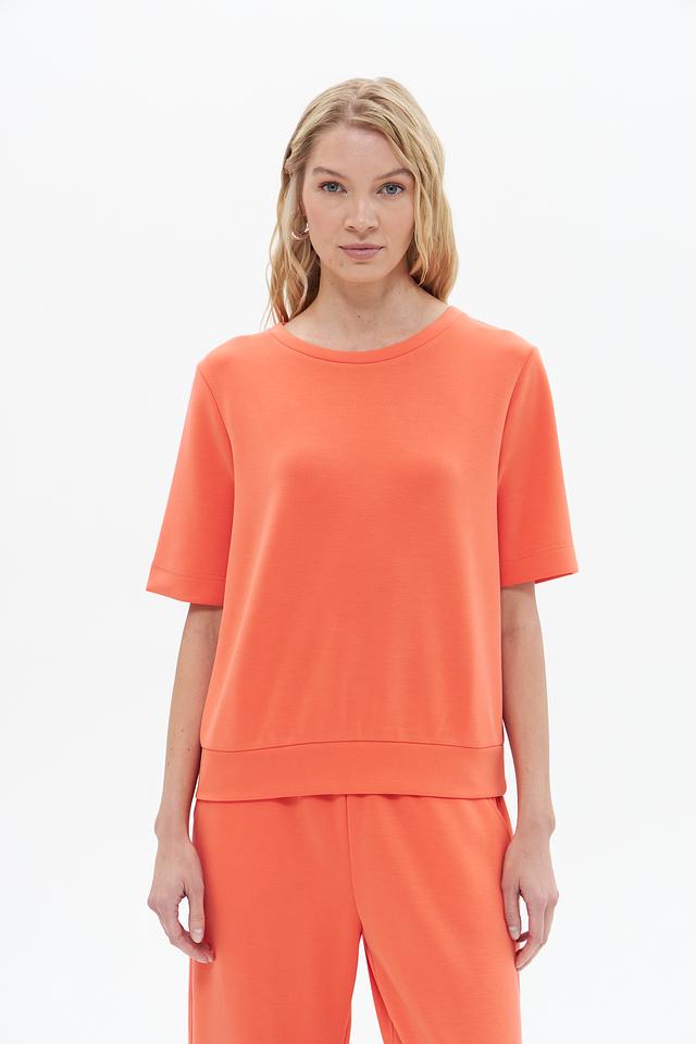 Пуловер имеет прямой крой и круглый вырез горловины. Короткие рукава делают его идеальным для теплой погоды. Мягкий трикотаж обеспечивает комфорт при носке, а добавление эластана придает изделию небольшую эластичность, позволяя ему хорошо сидеть по фигуре.