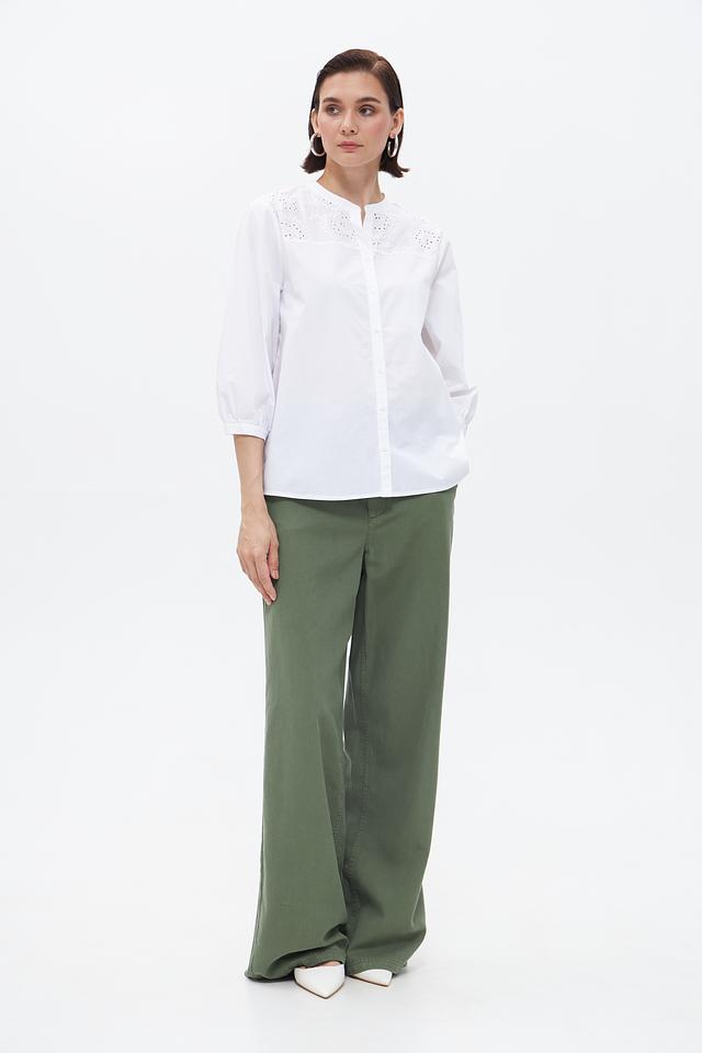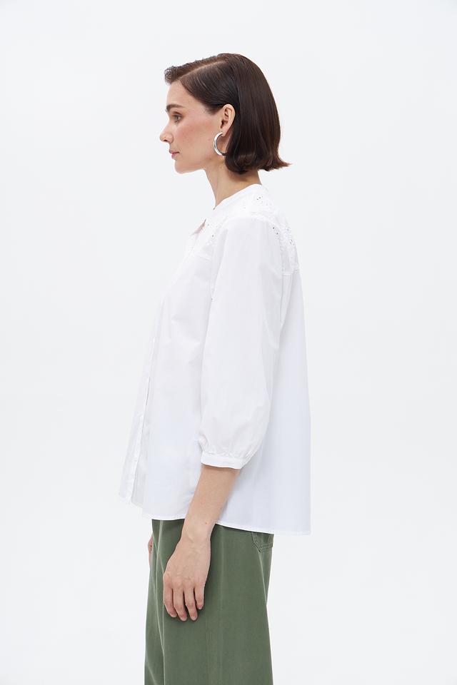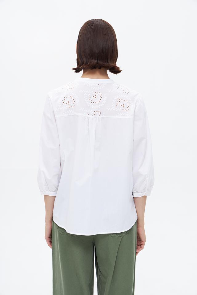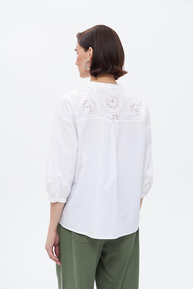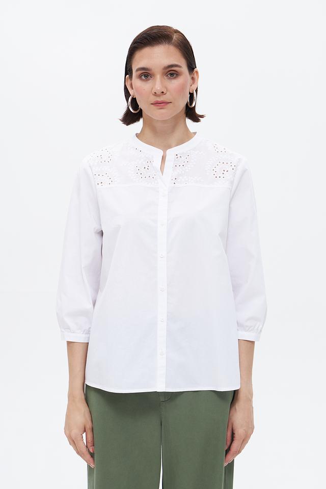 Особенностью модели является декоративная вышивка на горловине и рукавах, придающая ей изысканность и женственность. Блузка имеет классический крой с ¾ рукавами и застежкой на пуговицы.