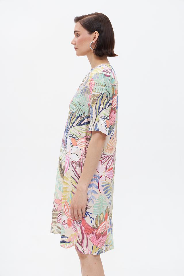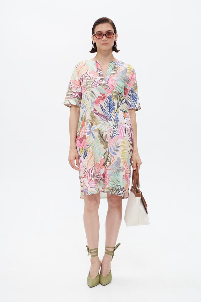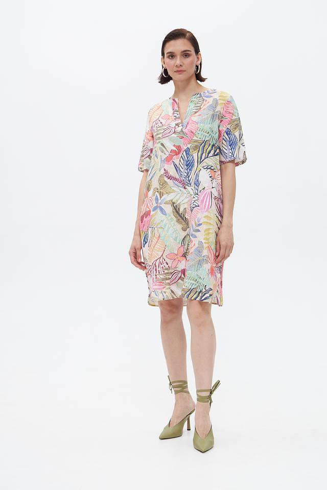 Платье имеет яркий цветочный принт, который придает ему женственности и очарования. V-образный вырез и короткие рукава делают его идеальным для теплых дней. Свободный крой обеспечивает комфорт и свободу движений.