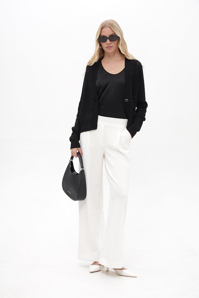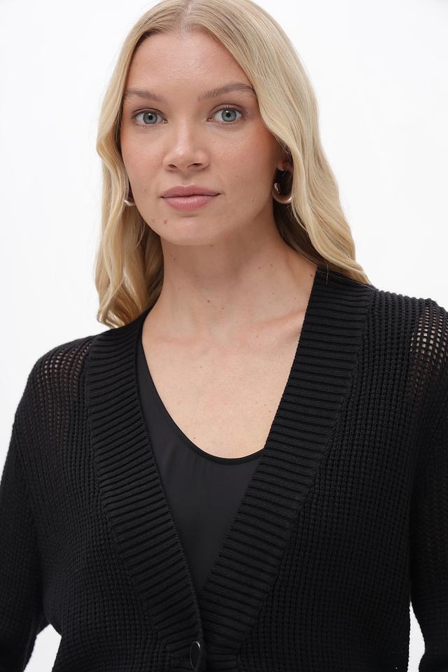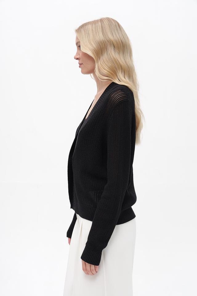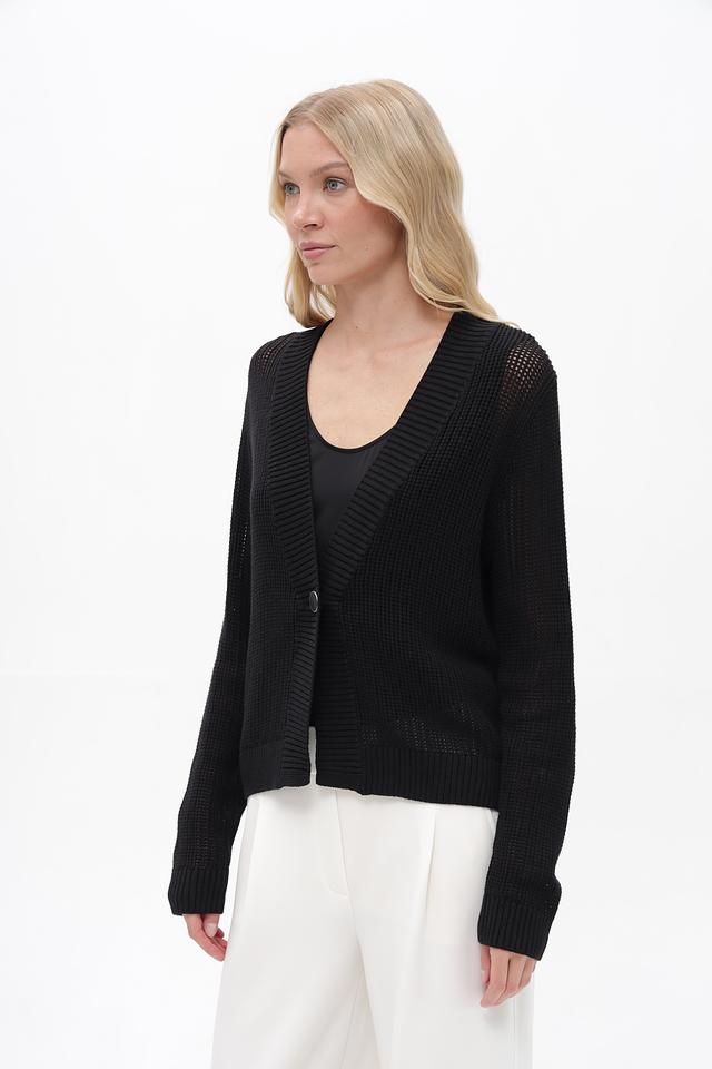 Жакет имеет классический крой с V-образным вырезом и длинными рукавами. Застёжка на одну пуговицу позволяет регулировать силуэт. Текстурный вязаный узор добавляет изделию изысканности.