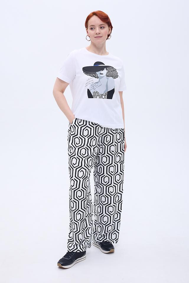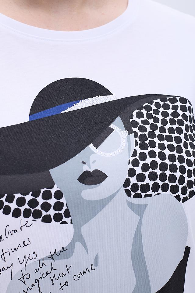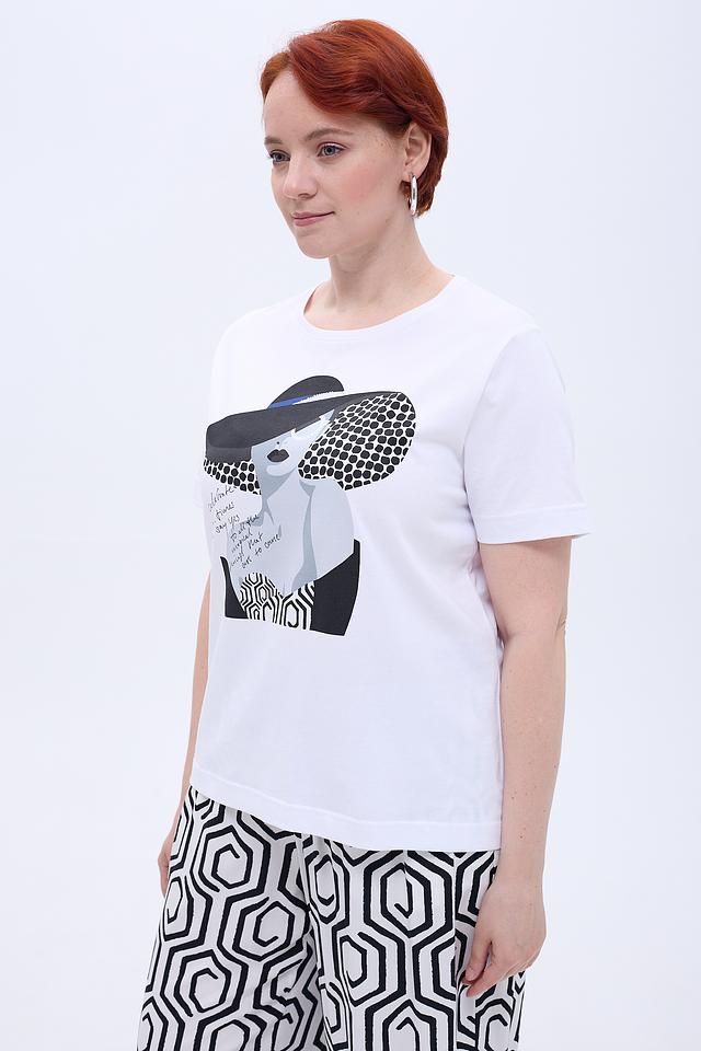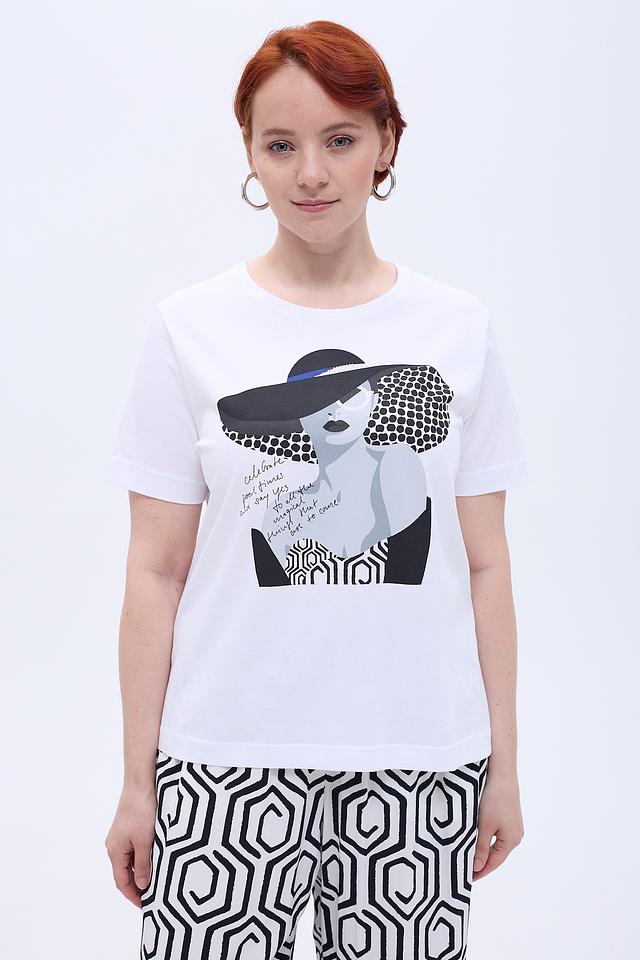 Белая футболка Gerry Weber с оригинальным графичным принтом в виде изображения женщины в шляпе. Изготовлена из 100% хлопка, обеспечивающего комфорт в носке. Идеально сочетается с юбками и брюками. Состав: хлопок 100%