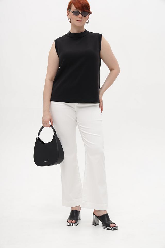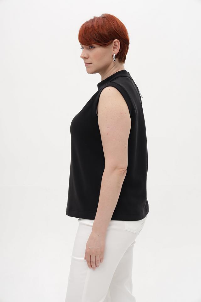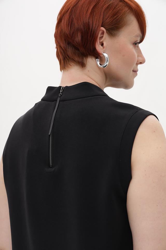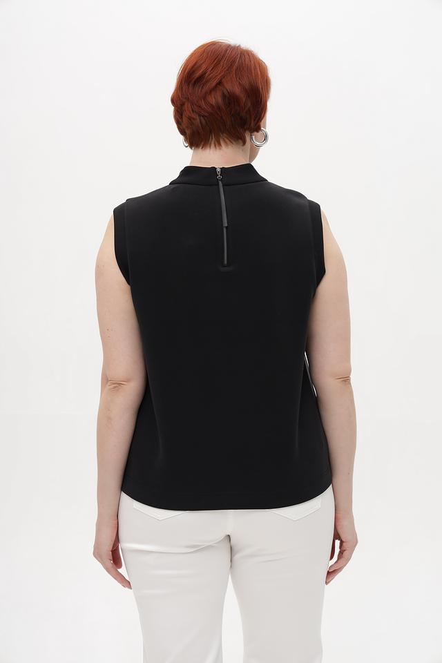Топ имеет классический крой без рукавов и аккуратную округлую горловину. Спинка дополнена потайной молнией, обеспечивающей удобство надевания и снятия. Благодаря своему лаконичному дизайну, этот топ легко сочетается с различными элементами одежды – от классических брюк до юбок и джинсов.
