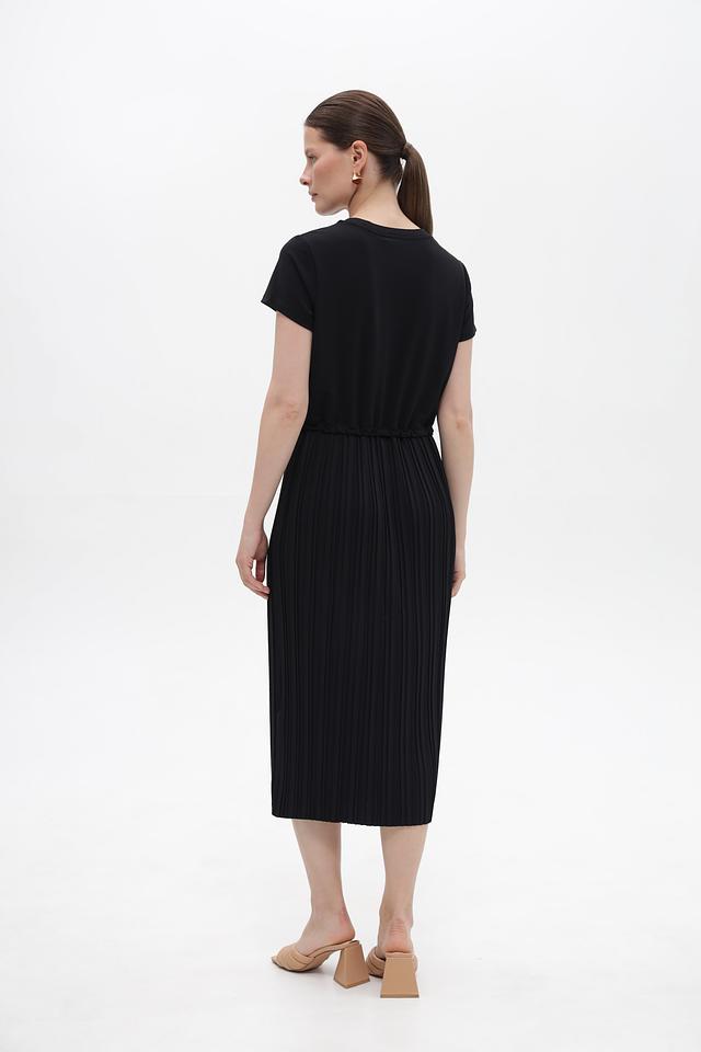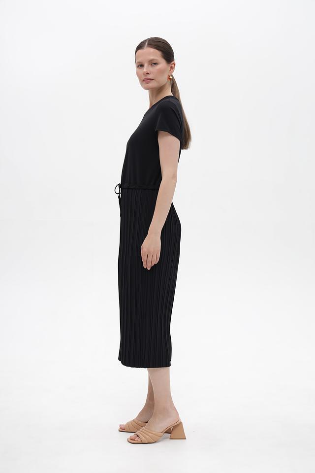 Верх платья выполнен из гладкой ткани, а юбка – из плиссированного материала, создающего лёгкий и воздушный силуэт. Завязки на талии позволяют регулировать посадку и подчеркнуть фигуру.