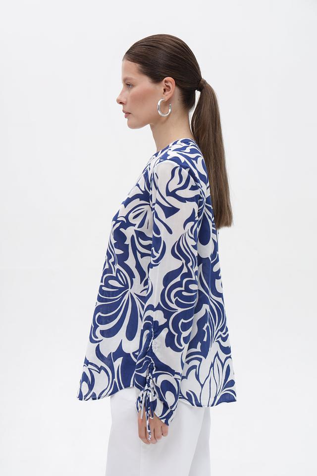 Особенность модели – яркий и запоминающийся цветочный принт в сине-белой гамме, который придает блузке особую изысканность. Свободный крой обеспечивает свободу движений и комфортную посадку по фигуре.