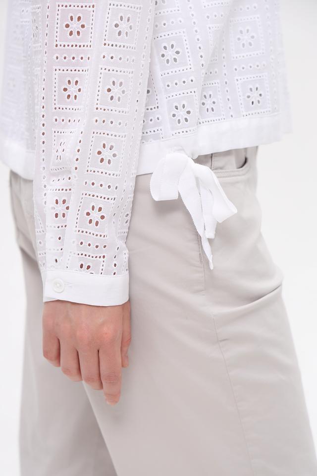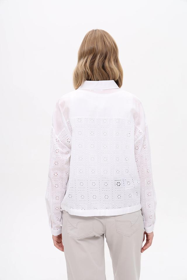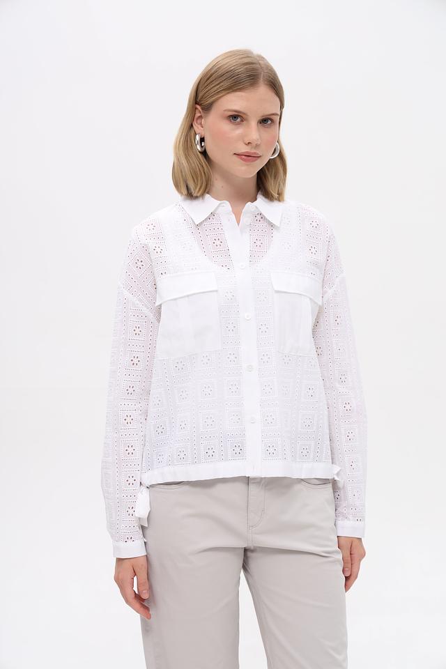 Белая блузка Gerry Weber из 100% хлопка с ажурной вышивкой. Стильная модель с длинным рукавом, воротником и нагрудными карманами станет отличным дополнением к вашему гардеробу. Состав: хлопок 100%