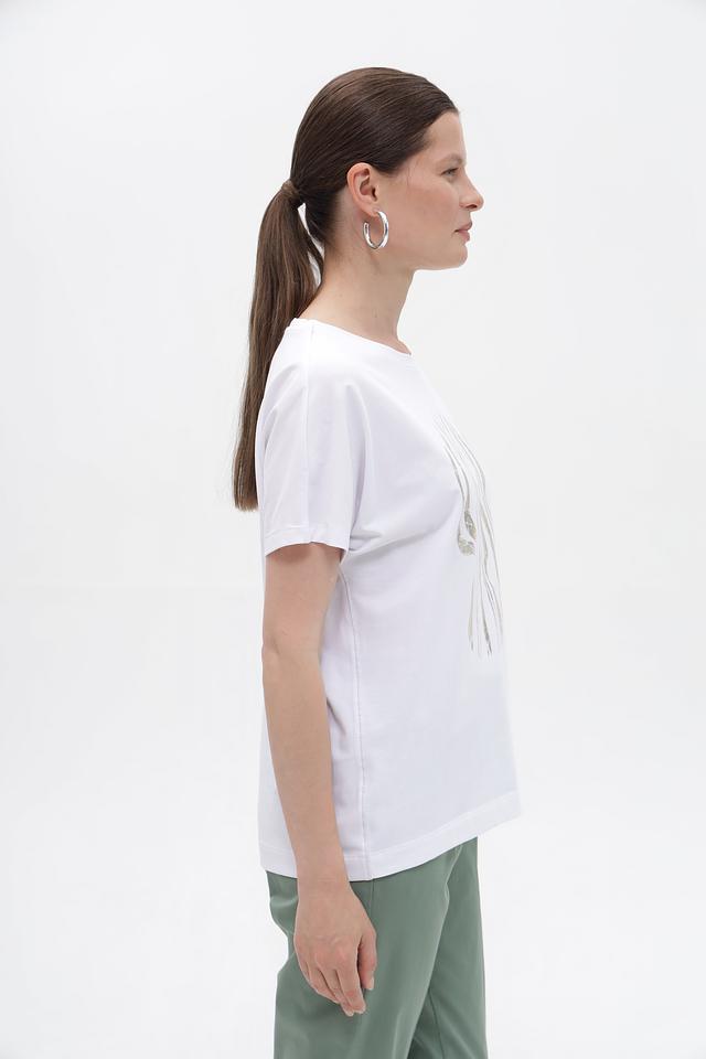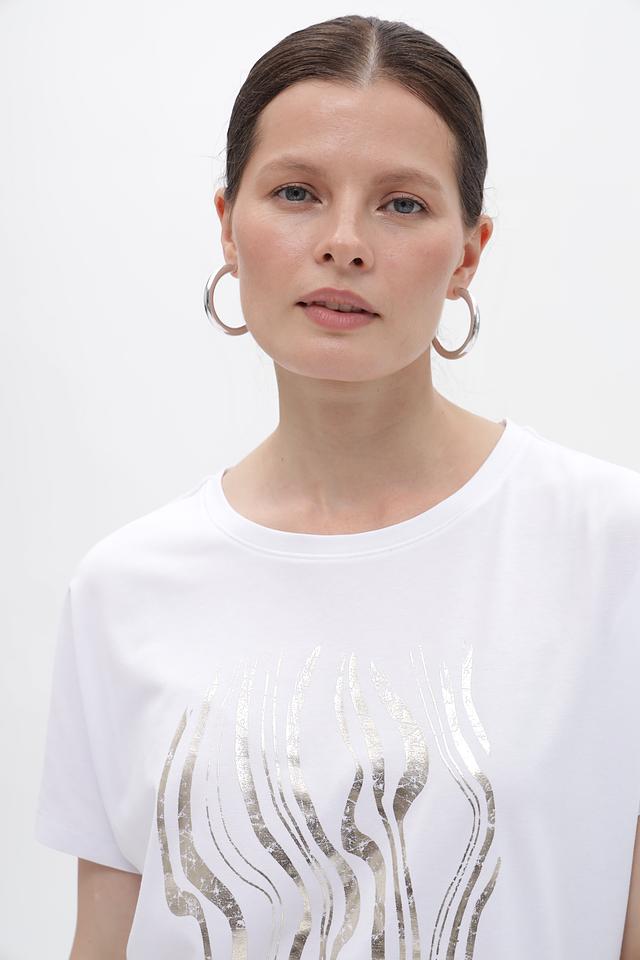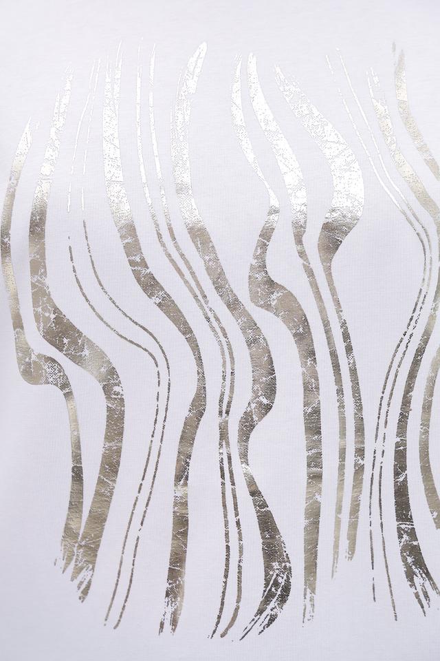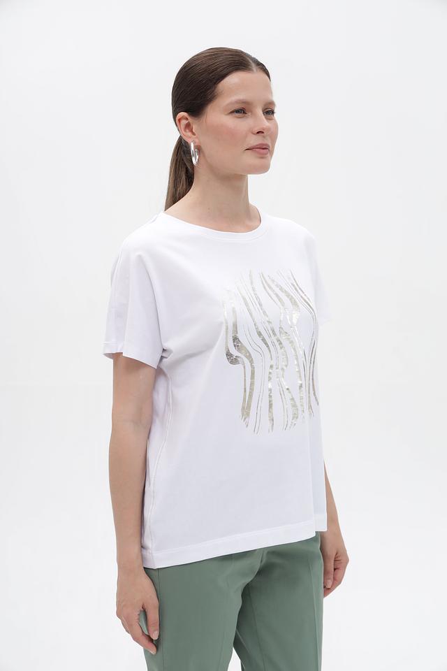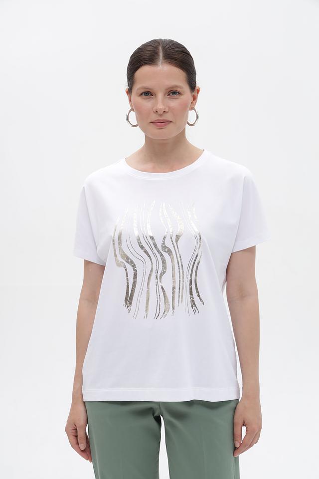Белая футболка Gerry Weber с оригинальным золотистым принтом. Изготовлена из мягкого хлопка с добавлением эластана для комфорта и лучшей посадки. Состав: хлопок 94%, эластан 6%