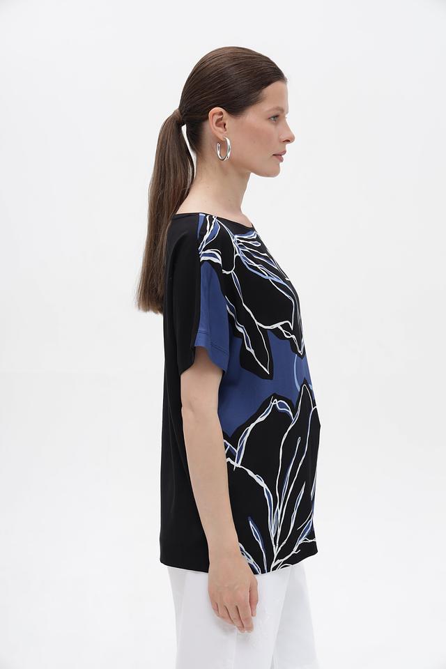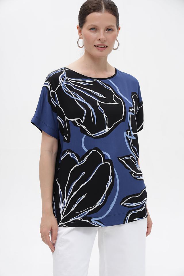Блузка имеет свободный крой, круглый вырез горловины и короткие рукава. Особенностью модели является яркий цветочный принт, который придает ей изысканный и женственный вид. Благодаря своему универсальному дизайну, эту блузку можно сочетать с различными предметами одежды – от классических брюк до юбок и джинсов.