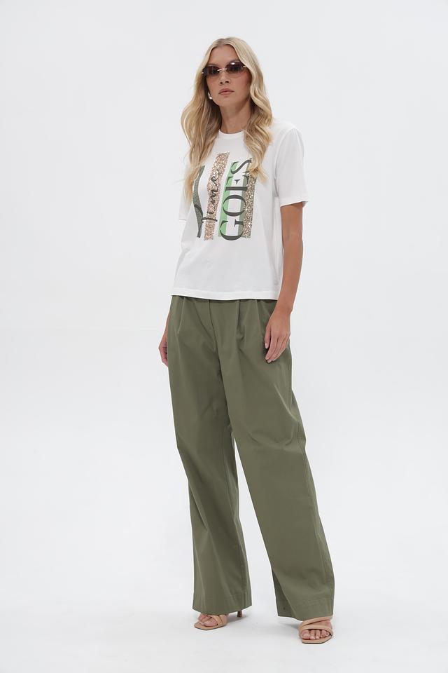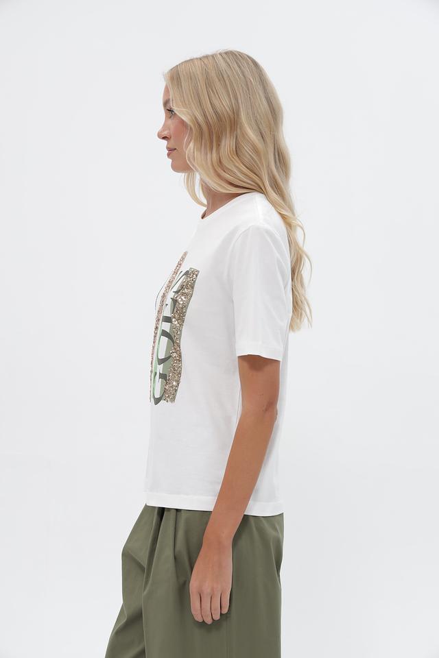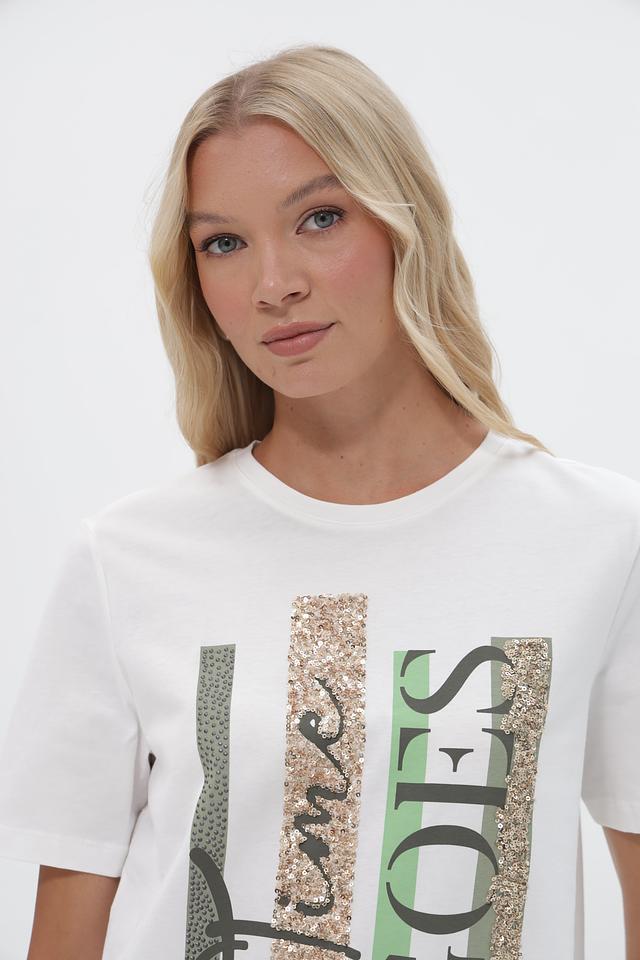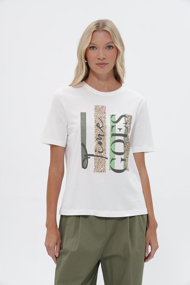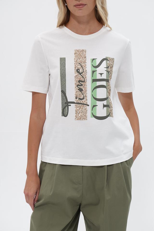 Особенность этой футболки – оригинальный принт, который добавляет образу индивидуальность. Надпись “time GOES” выполнена в сочетании золотистых и зеленых оттенков, что привлекает внимание.