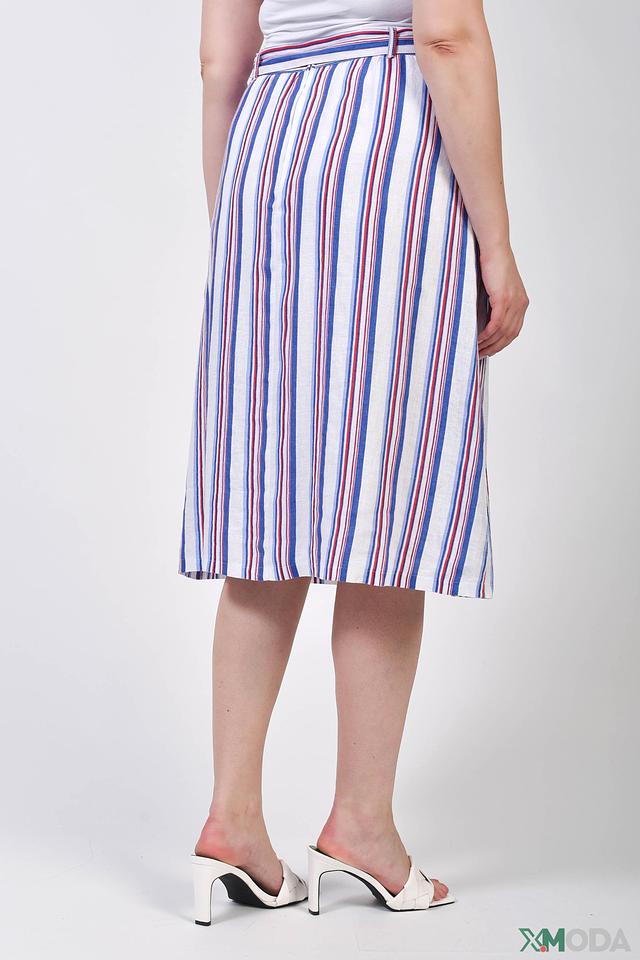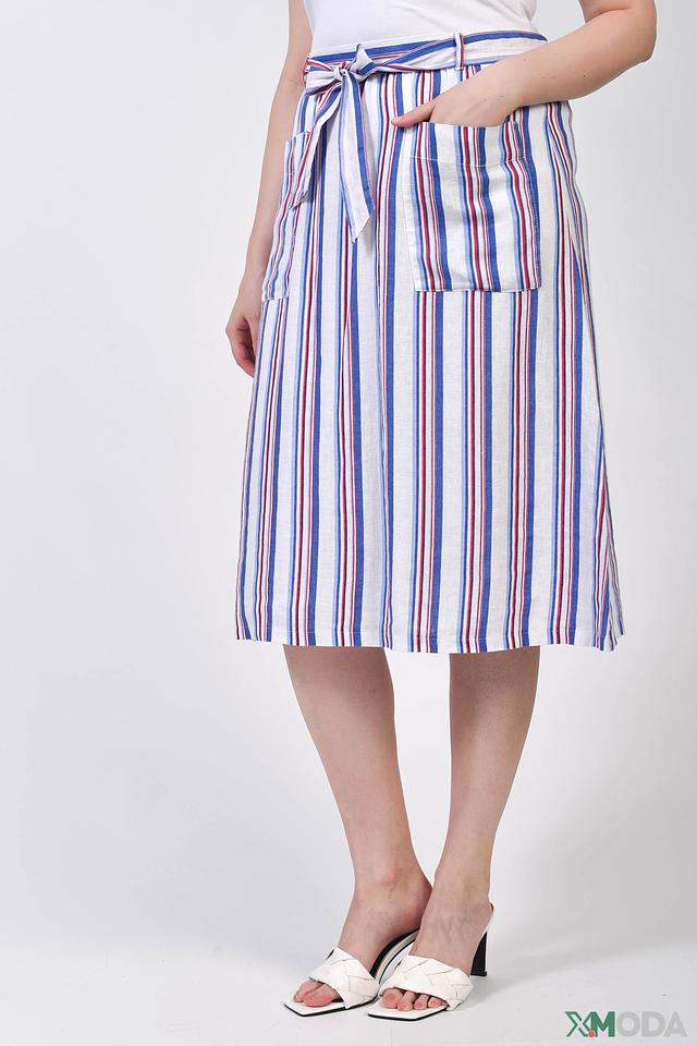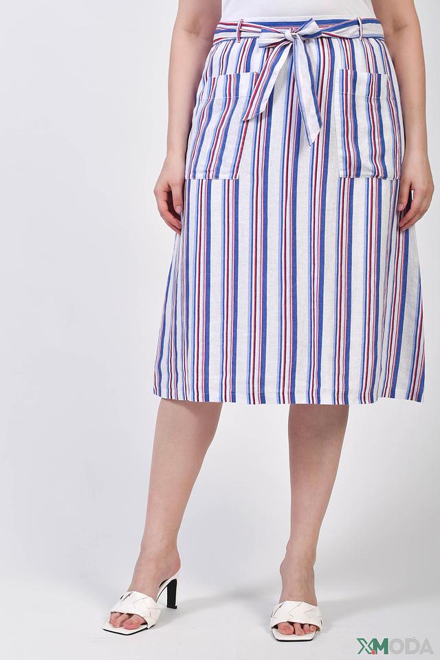 Юбка имеет классическую длину миди и яркий полосатый принт в сочетании белого, красного и синего цветов. Завязки на талии позволяют регулировать посадку и подчеркивать фигуру. Боковые карманы добавляют практичности и удобства.