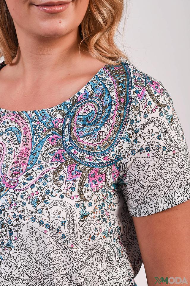 Блуза имеет прямой крой и короткие рукава, что делает ее идеальным выбором для теплой погоды. Округлый вырез горловины декорирован вышивкой в тон принта.