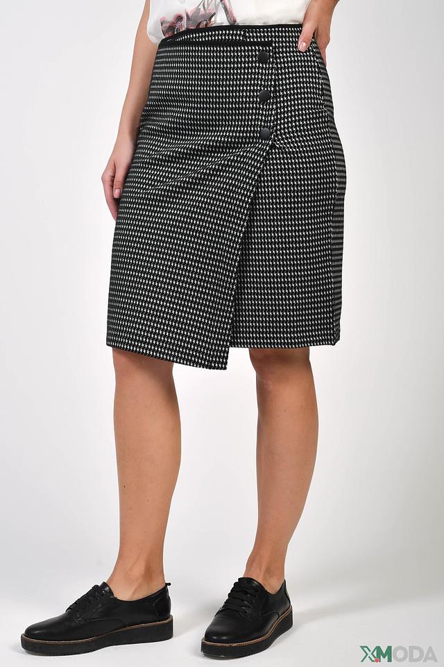 Юбка Gerry Weber чёрно-белого цвета с классическим клетчатым принтом. Модель выполнена с асимметричным кроем и декоративными пуговицами, что придает ей особый шарм. Состав: полиэстер 58%, хлопок 36%, эластан 6%