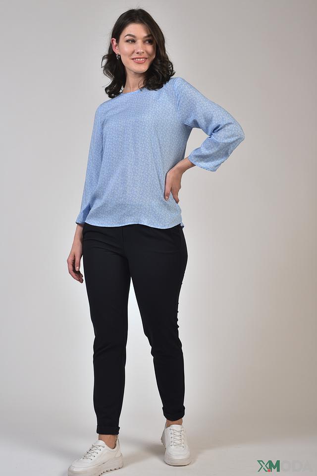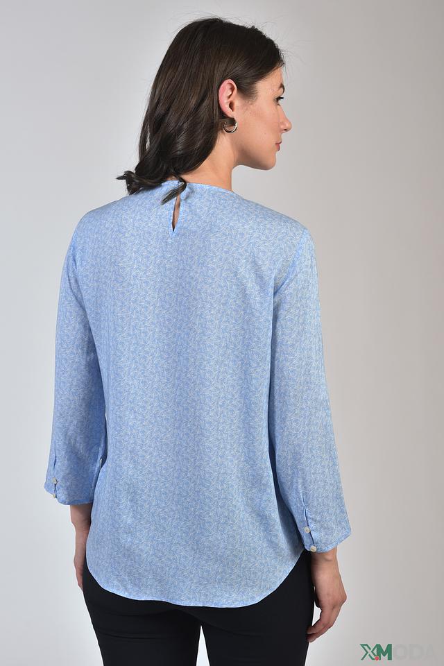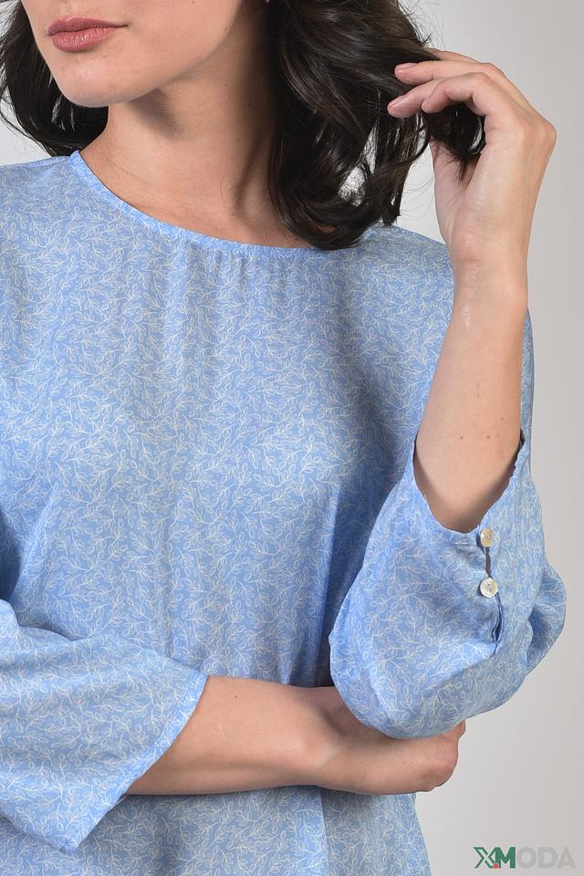 Блуза имеет лёгкий, струящийся силуэт и украшена деликатным цветочным принтом голубого оттенка. Округлый вырез горловины и рукава три четверти с аккуратными манжетами на пуговицах придают ей элегантный и женственный вид.