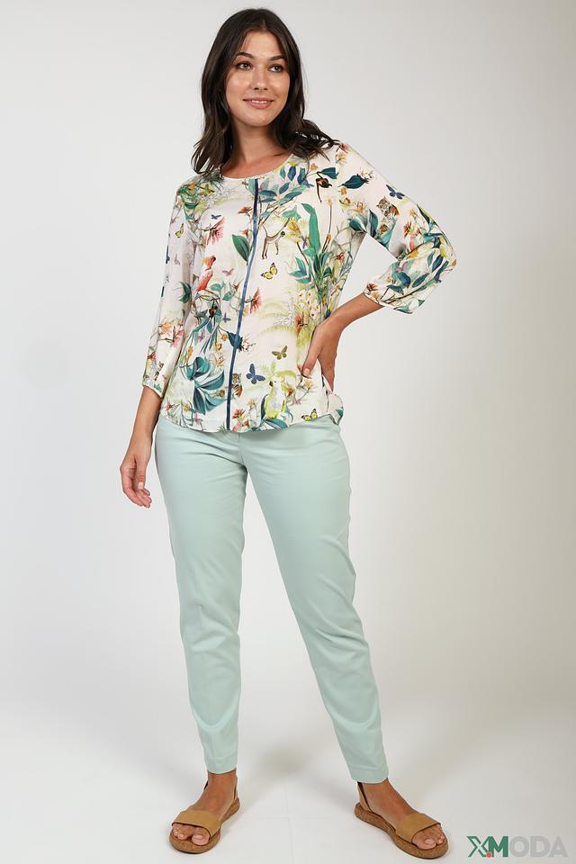 Основной цвет блузы – белый, который служит идеальным фоном для красочного принта. Принт состоит из изображения экзотических птиц, ярких цветов и пышной зелени, создавая тропическую атмосферу.