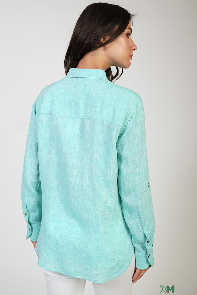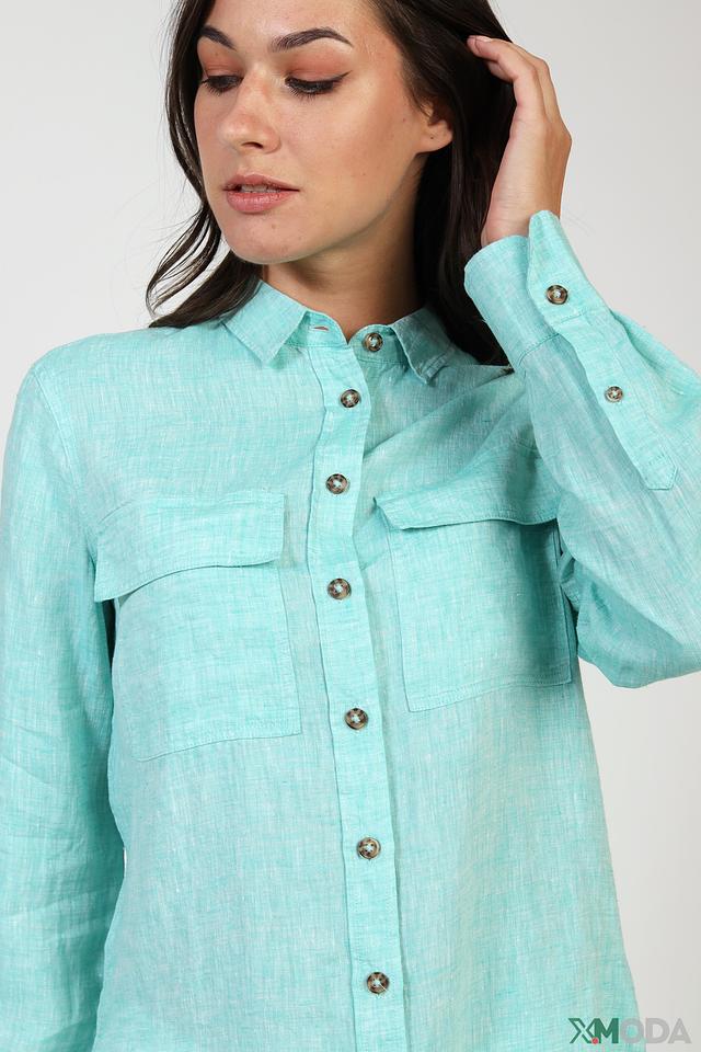 Блуза выполнена в нежном мятном цвете, который освежает и гармонично сочетается с различными оттенками. Отличительной особенностью модели являются накладные карманы на груди, добавляющие ей функциональности и непринужденности.