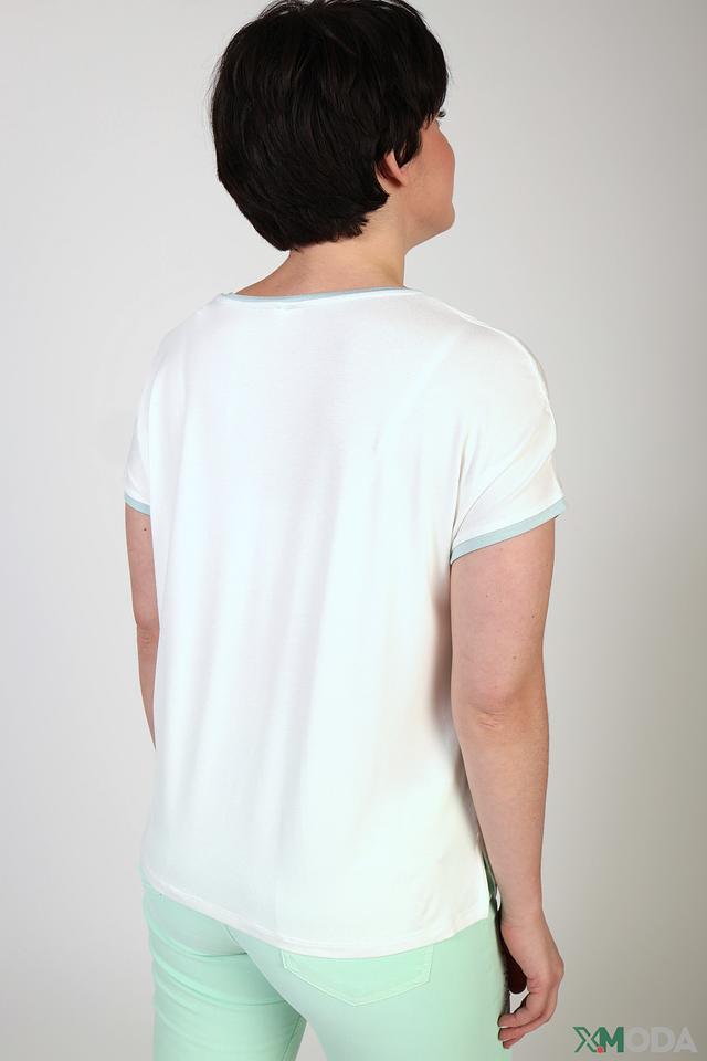 Модель имеет прямой крой, короткие рукава с манжетами и круглый вырез горловины, отделанный контрастным бирюзовым кантом. Благодаря составу из 95% вискозы и 5% эластана, футболка приятна к телу, хорошо драпируется и не сковывает движений.