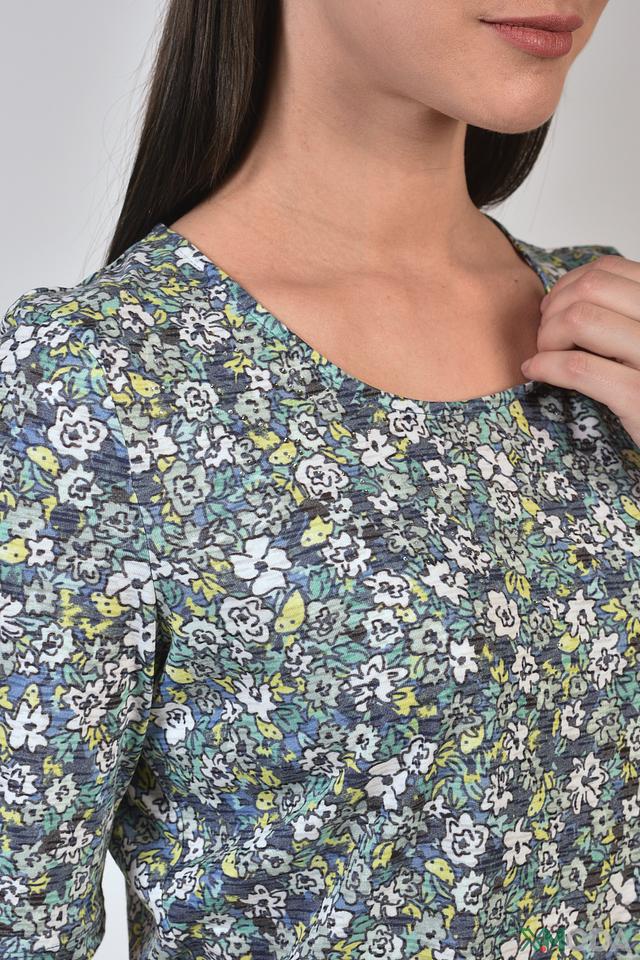 Модель имеет округлый вырез горловины и короткие рукава. Блуза выполнена из сочетания полиэстера (65%) и вискозы (35%), что обеспечивает ей мягкость, лёгкость и хорошую посадку по фигуре. Ткань приятна к телу и не требует сложного ухода.