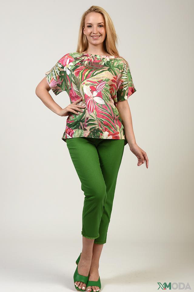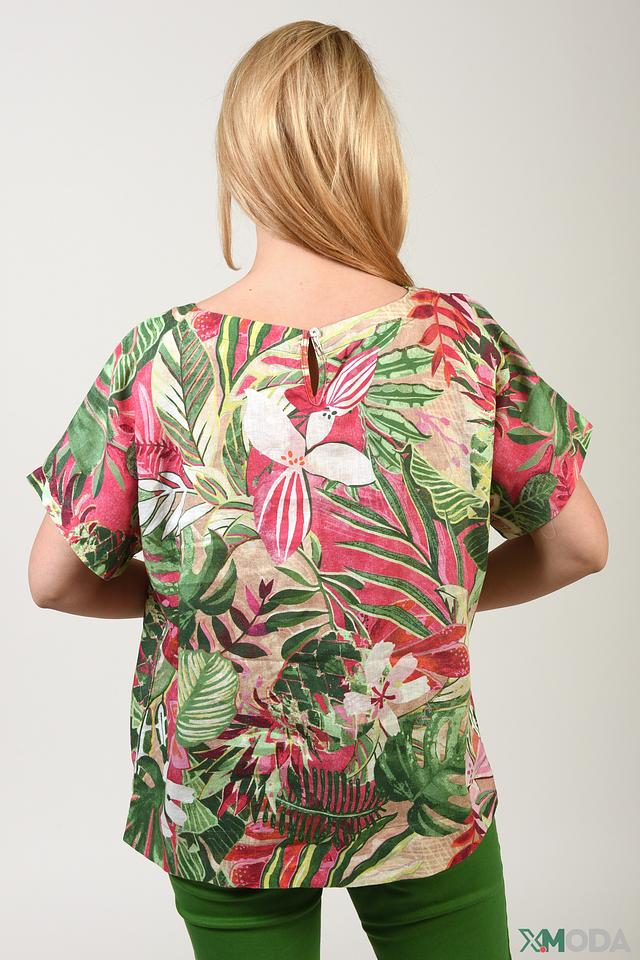 Блуза имеет свободный крой и короткие рукава, что делает её удобной в носке. Яркий цветочный принт добавляет образу женственности и легкости. Округлый вырез горловины.
