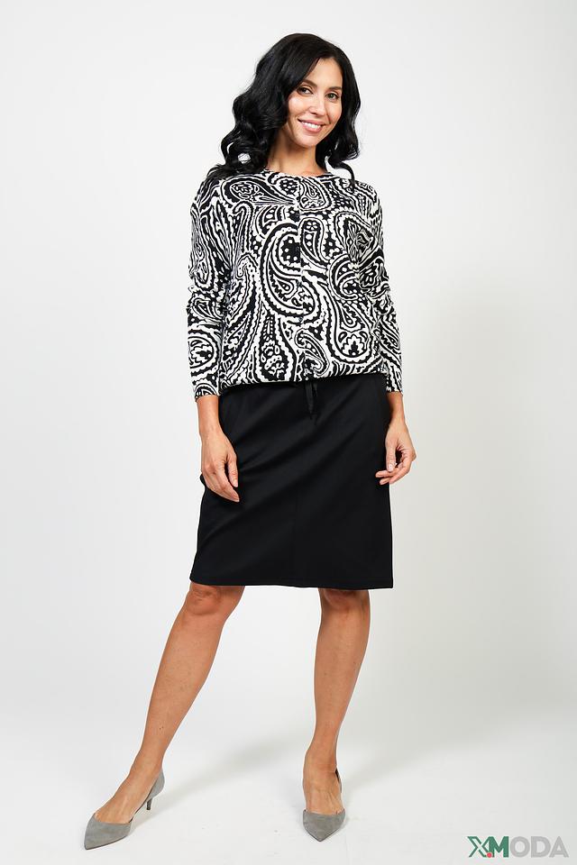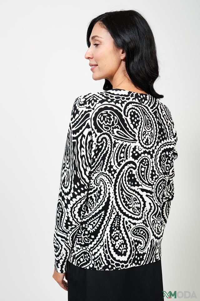 Жакет имеет прямой крой и длину до бедра. Его отличает оригинальный черно-белый принт в виде узора "пейсли", который придает образу изысканность. Модель выполнена из 100% хлопка, что обеспечивает приятные тактильные ощущения и комфорт в носке.