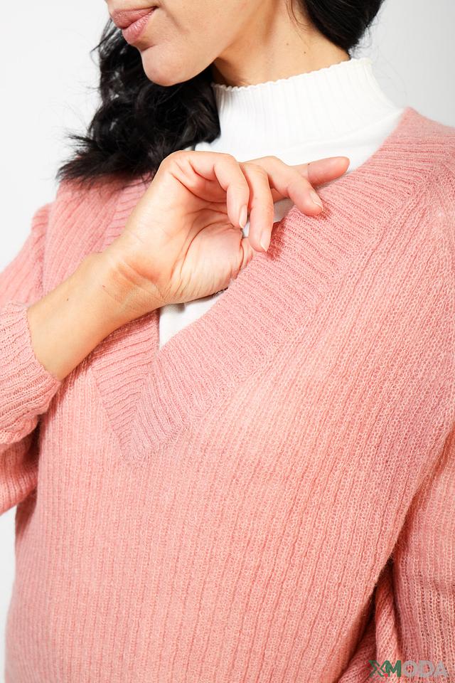 Пуловер имеет объёмные рукава, придающие ему современный и модный вид. Текстура вязки добавляет изделию объём и фактурность. Состав пуловера включает акрил, полиамид и мохер, благодаря чему он приятен к телу, хорошо держит форму и не требует особого ухода.