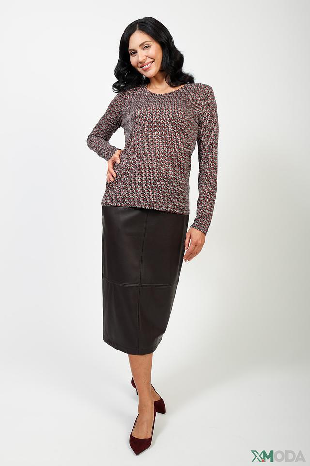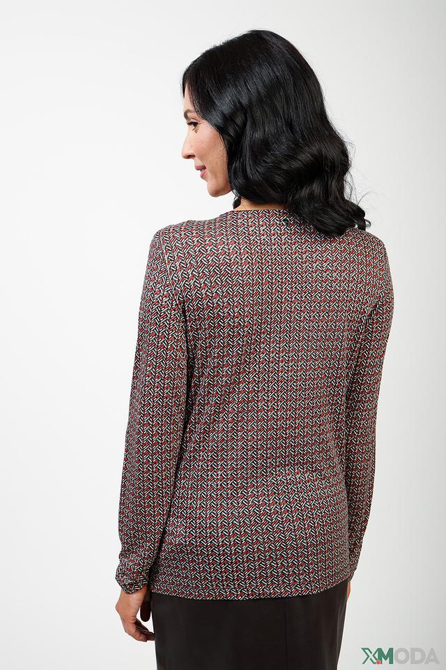 Блуза имеет длинные рукава и круглый вырез горловины. Её особенностью является яркий геометрический принт, выполненный в сочетании красных, синих и белых оттенков. Принт придает блузе оригинальность и делает её заметной деталью образа.
