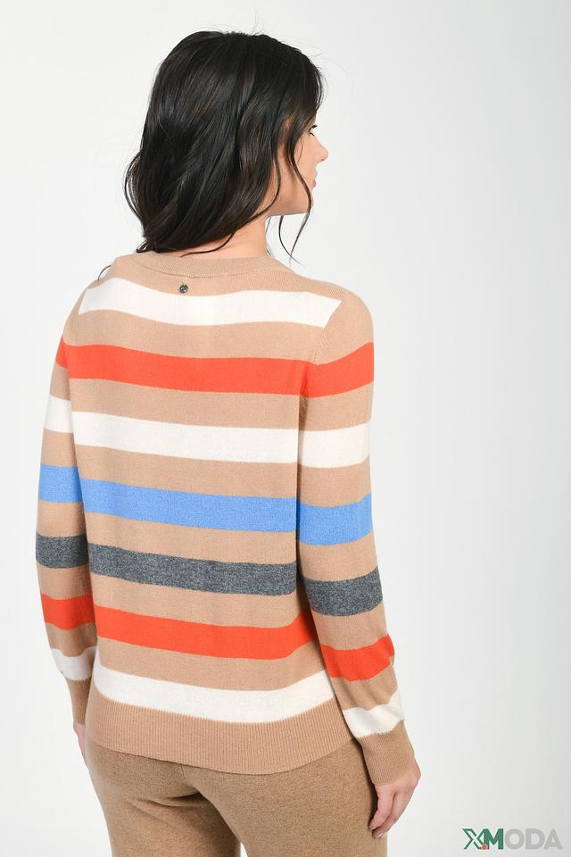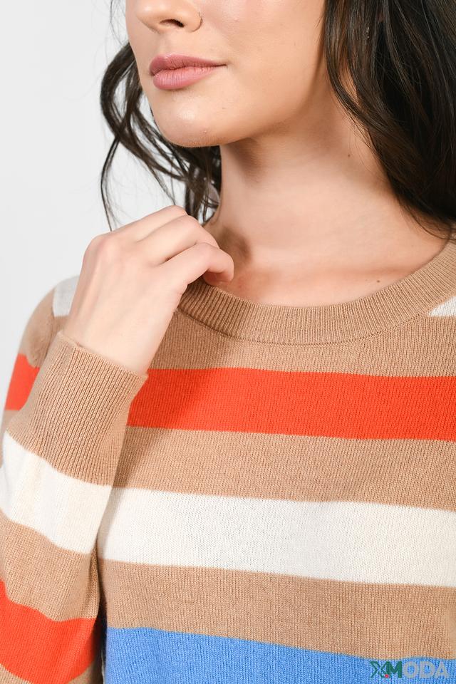 Этот женский пуловер от Gerry Weber станет прекрасным дополнением к вашему гардеробу. Модель выполнена в полоску, сочетающую бежевые, оранжевые, голубые и серые оттенки, что придает ей особый шарм.