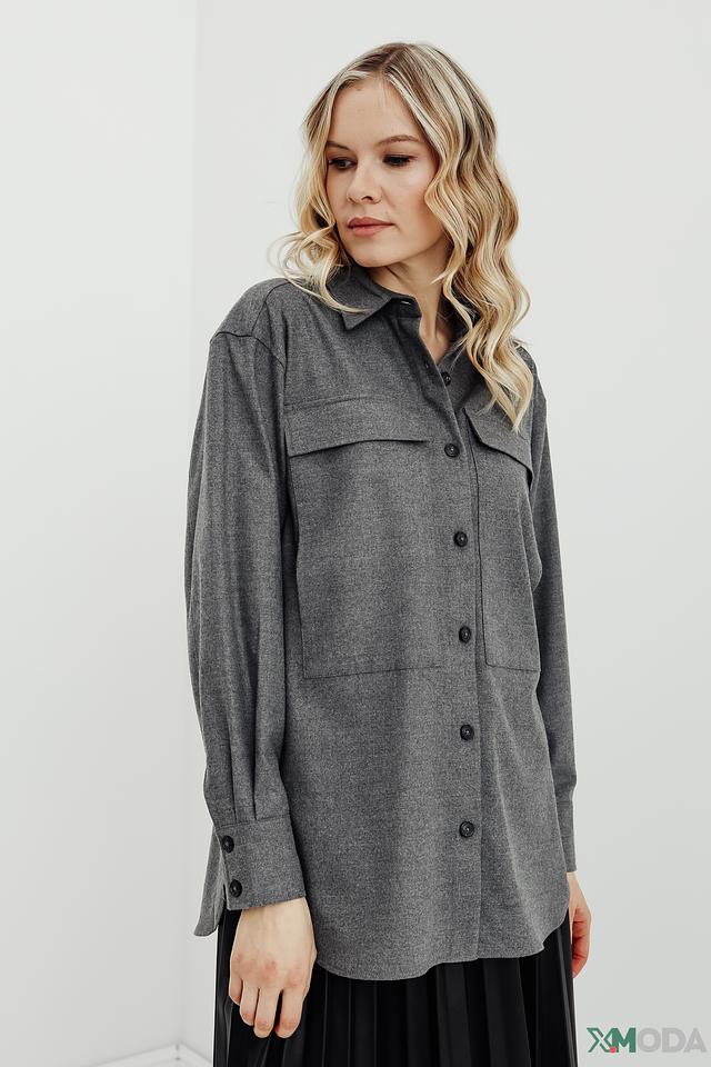 Рубашка имеет классический крой с длинными рукавами и отложным воротником. На груди расположены две накладные карманы, добавляющие функциональности и стиля.