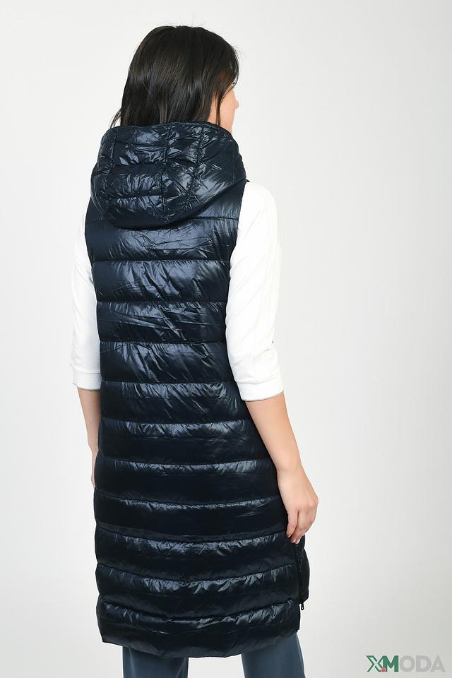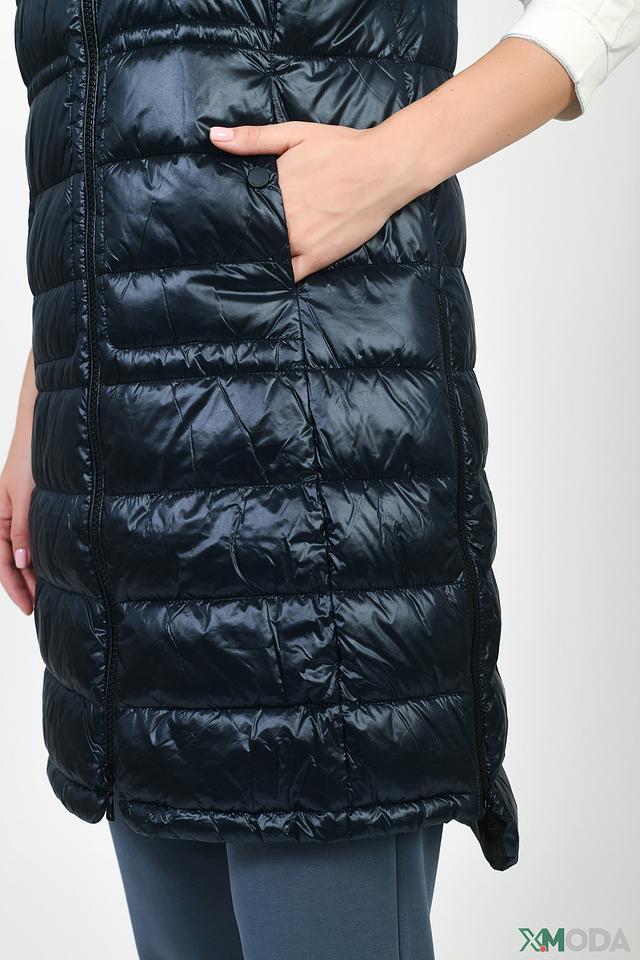 Жилет имеет удлиненный силуэт, который хорошо сочетается с различными стилями одежды. Капюшон добавляет функциональности и защищает от ветра и небольшого дождя. Стеганая фактура придает жилету современный и стильный вид.