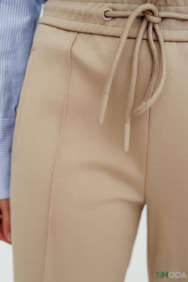 Джинсы имеют высокую посадку и прямой крой, что обеспечивает комфортную посадку по фигуре и визуально вытягивает силуэт. Завязки на поясе позволяют регулировать облегание и подчеркивают талию.