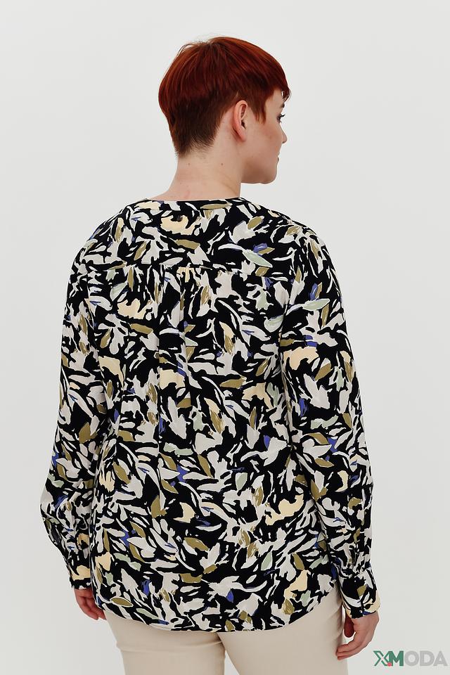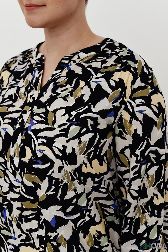 Основной цвет блузы – чёрный, но её украшает яркий и оригинальный принт, состоящий из цветочных мотивов в зелёных, жёлтых и голубых тонах. V-образный вырез горловины придаёт блузе женственности и элегантности. Длинные рукава делают её подходящей для прохладной погоды.