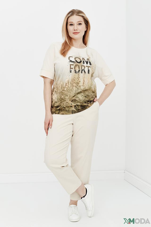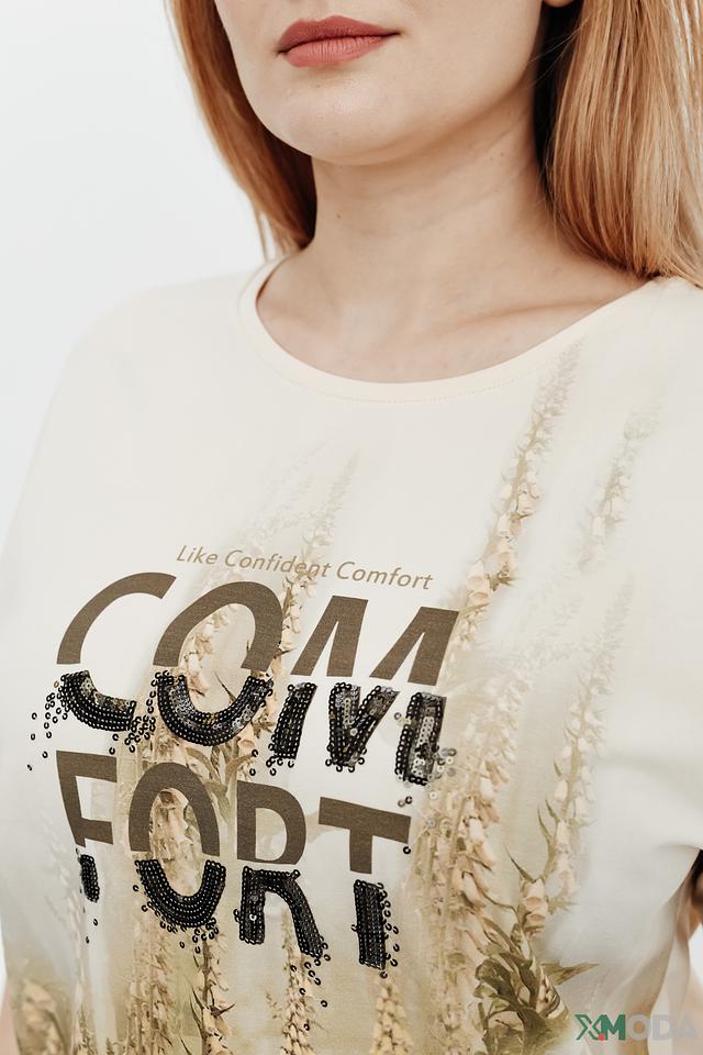 Женская футболка Gerry Weber бежевого цвета с ярким принтом "COMFORT" и цветочным узором. Изготовлена из мягкого хлопка с добавлением эластана для комфортной посадки и свободы движений. Состав: хлопок 92%, эластан 8%