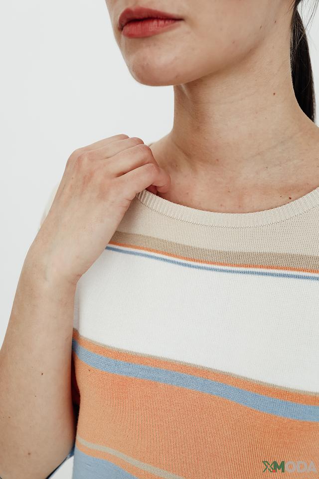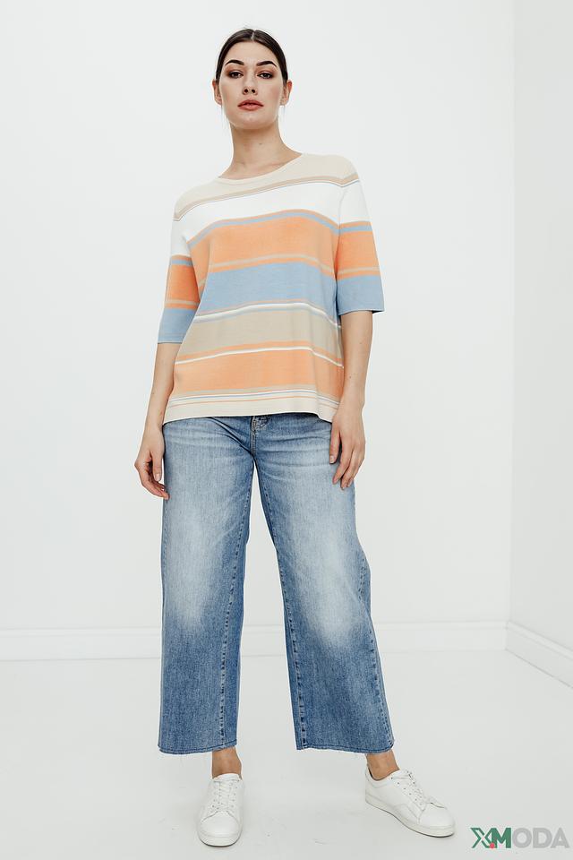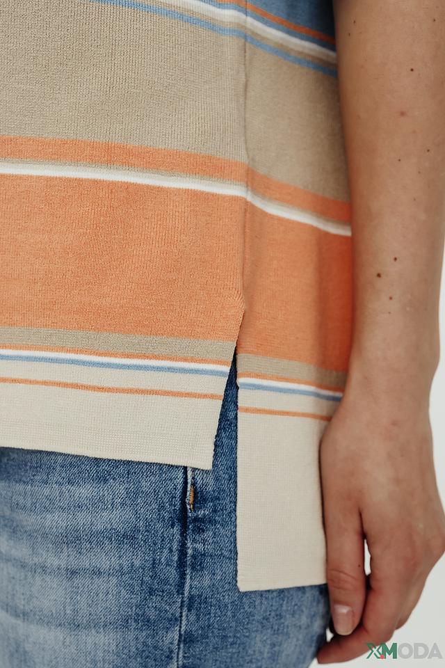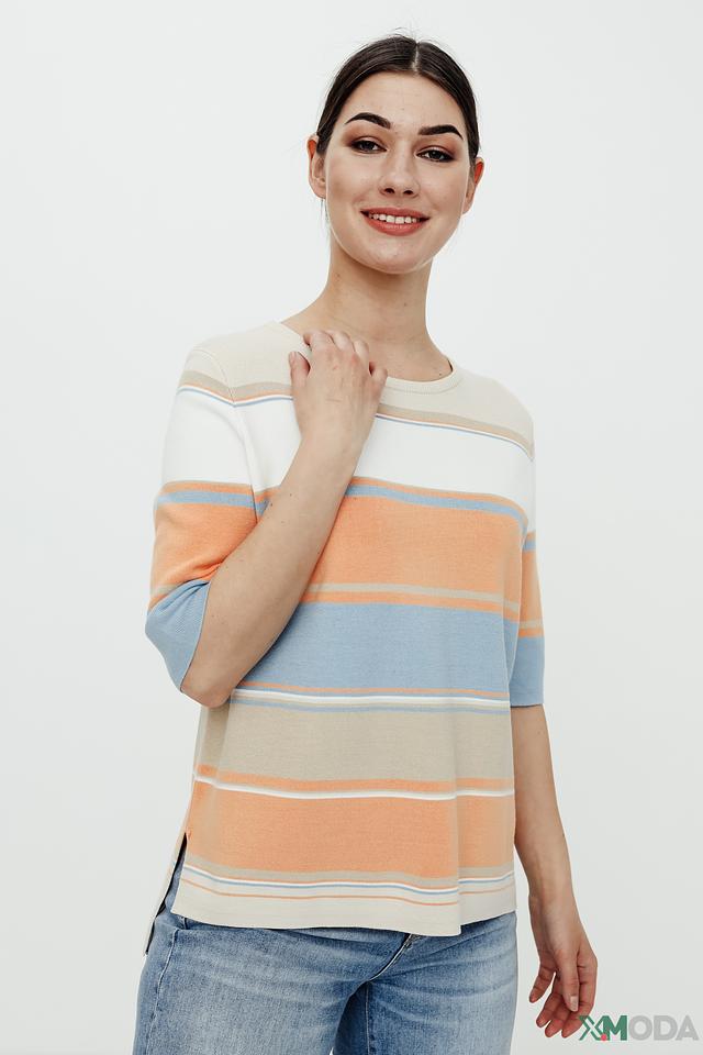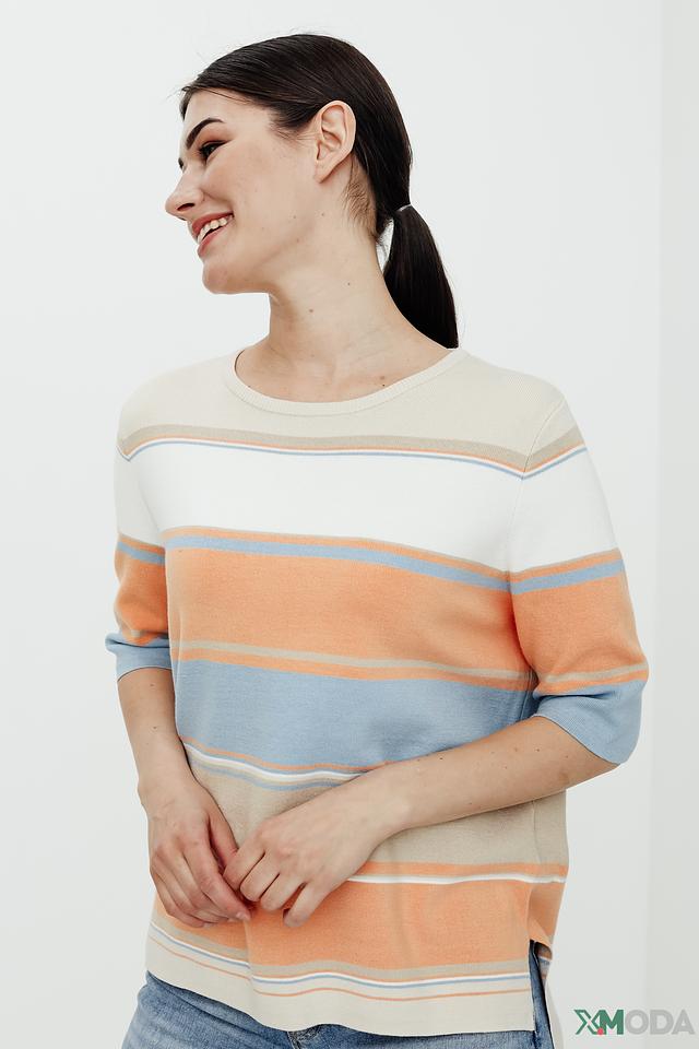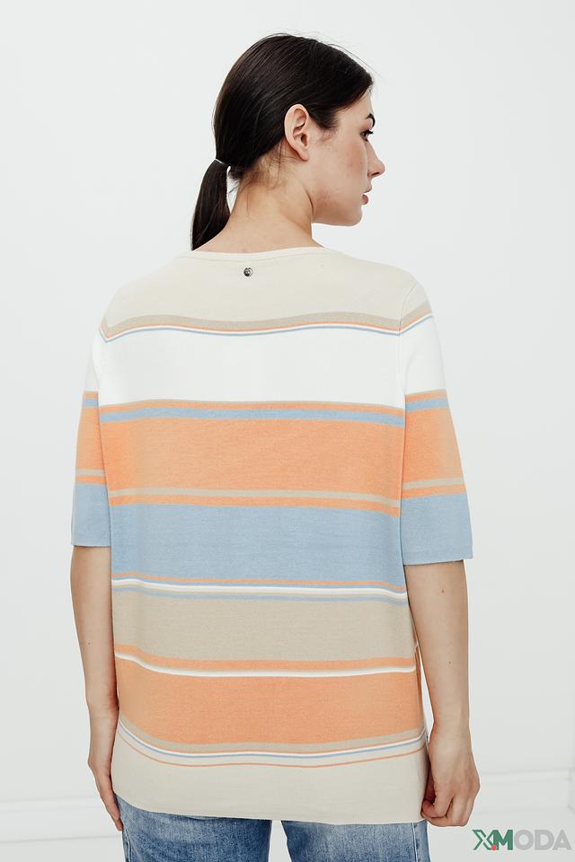 Этот стильный пуловер от Gerry Weber станет прекрасным выбором для создания комфортного и модного образа. Пуловер выполнен в горизонтальную полоску, сочетающую в себе оттенки бежевого, оранжевого и голубого. Округлый вырез горловины и короткие рукава делают его идеальным для теплой погоды.