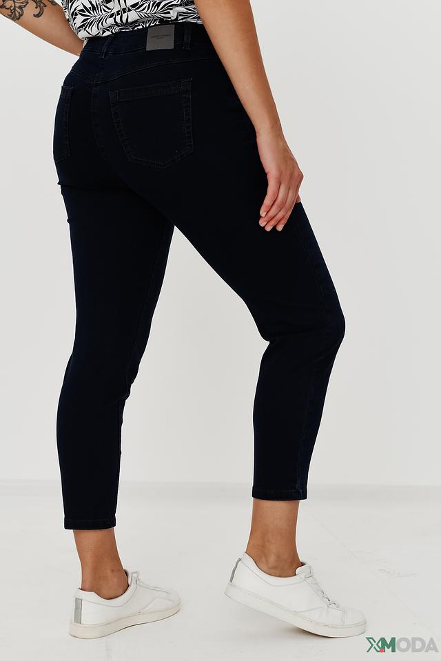 Капри имеют стандартную посадку по талии и зауженный крой, который подчеркивает фигуру. Застежка на молнию и пуговицу обеспечивает надежную фиксацию. На задних карманах выполнены декоративные швы.