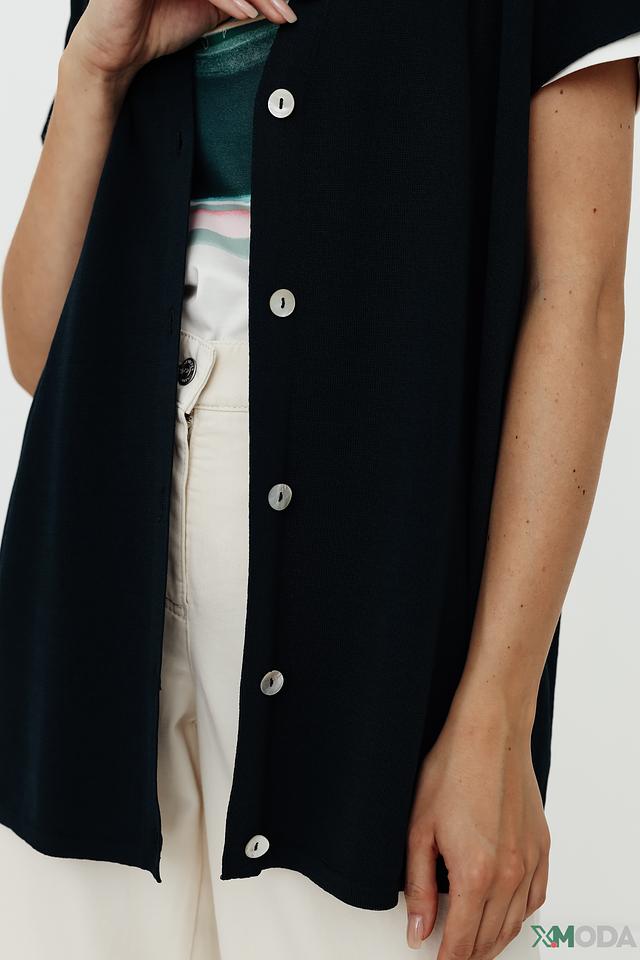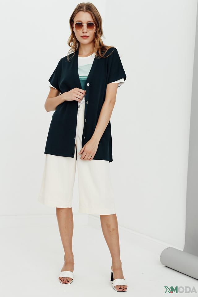 Кардиган имеет короткие рукава и удобную застёжку на пуговицы, что позволяет регулировать степень открытости и создавать разные образы. Прямой крой обеспечивает свободу движений и комфортную посадку по фигуре.
