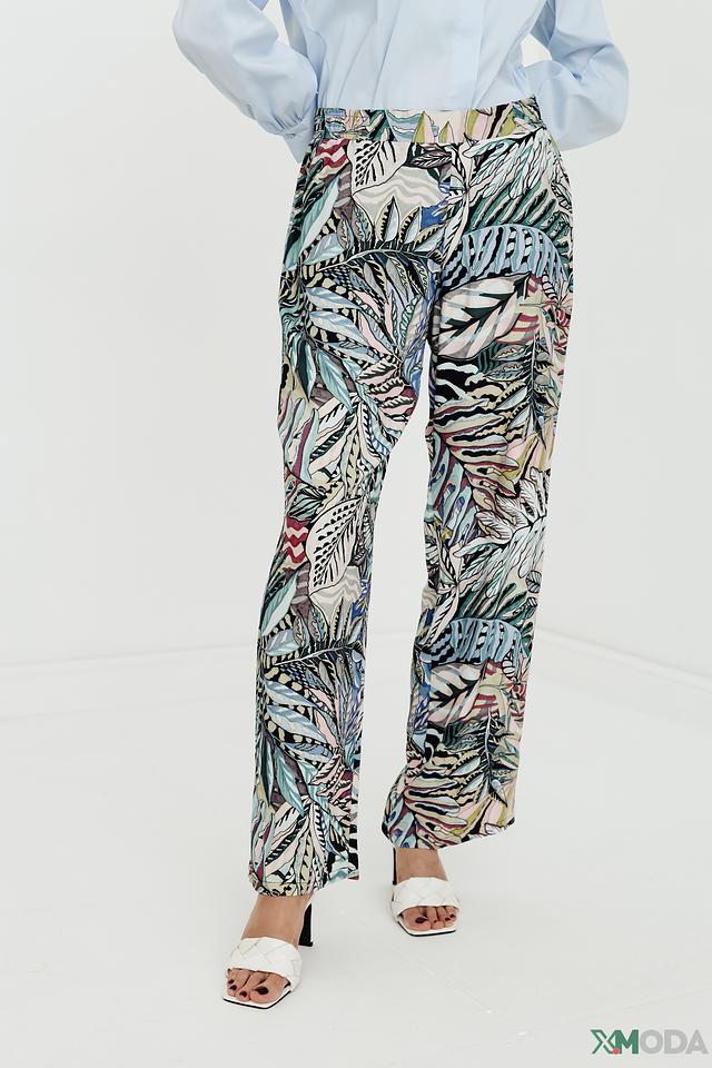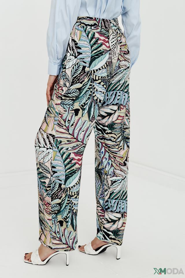Брюки отличаются широким кроем и высокой посадкой, что обеспечивает свободу движений и подчеркивает талию. Главная особенность – эффектный принт с изображением тропических листьев в разнообразных оттенках: зеленого, синего, розового и бежевого.