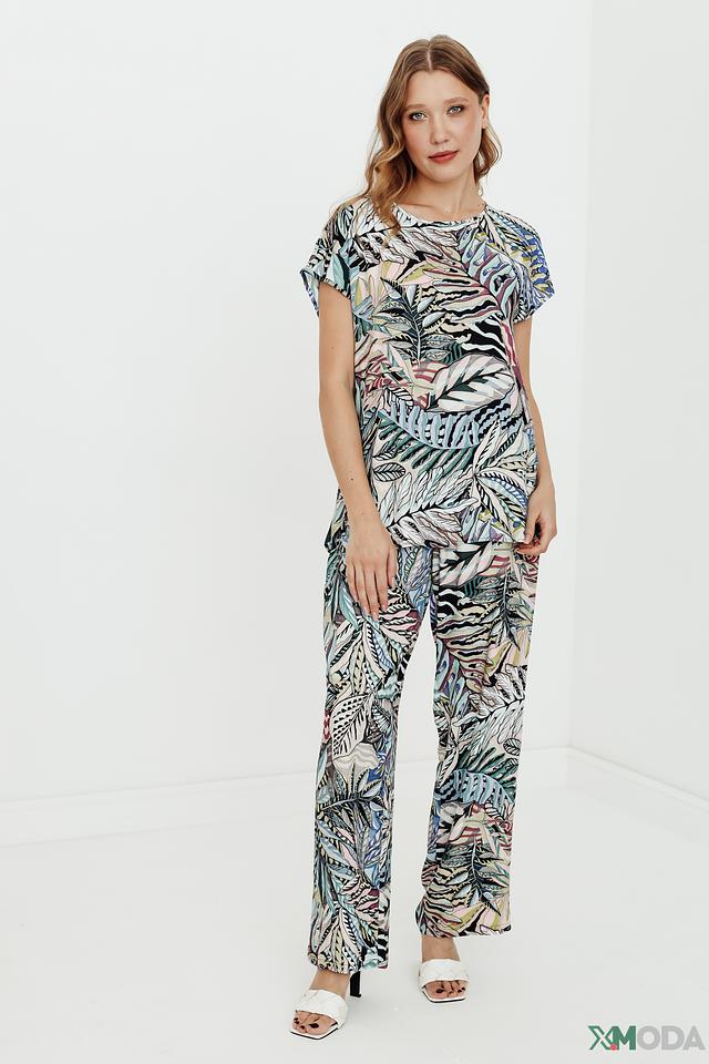 Особенностью данной модели является яркий и красочный принт с изображением тропических листьев и цветов. Сочетание различных оттенков зеленого, синего, бежевого и розового создает неповторимый и запоминающийся дизайн.