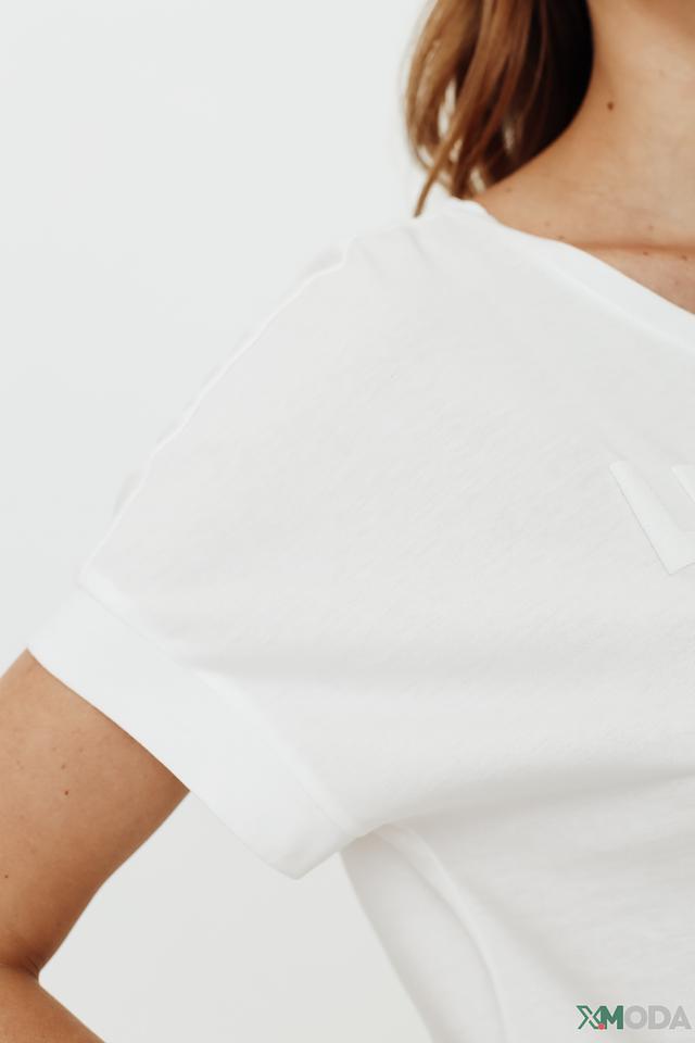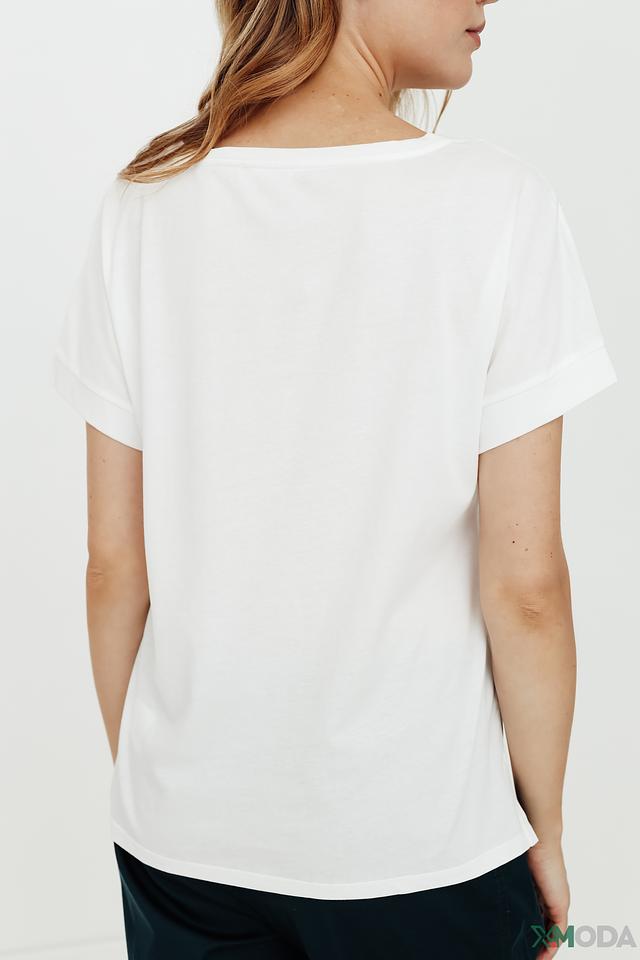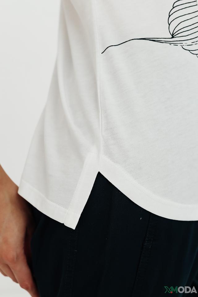Модель имеет прямой крой, короткие рукава с небольшим подворотом и округлый вырез горловины. Футболка выполнена из высококачественного органического хлопка, который приятен к телу, хорошо пропускает воздух и обеспечивает комфорт в течение всего дня.