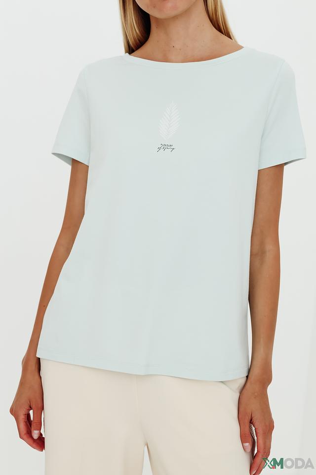Женская футболка Gerry Weber голубого цвета с нежным принтом в виде листа. Изготовлена из мягкого и приятного к телу сочетания хлопка, модала и эластана, обеспечивающего комфорт при носке. Состав: хлопок 47%, модал 45%, эластан 8%