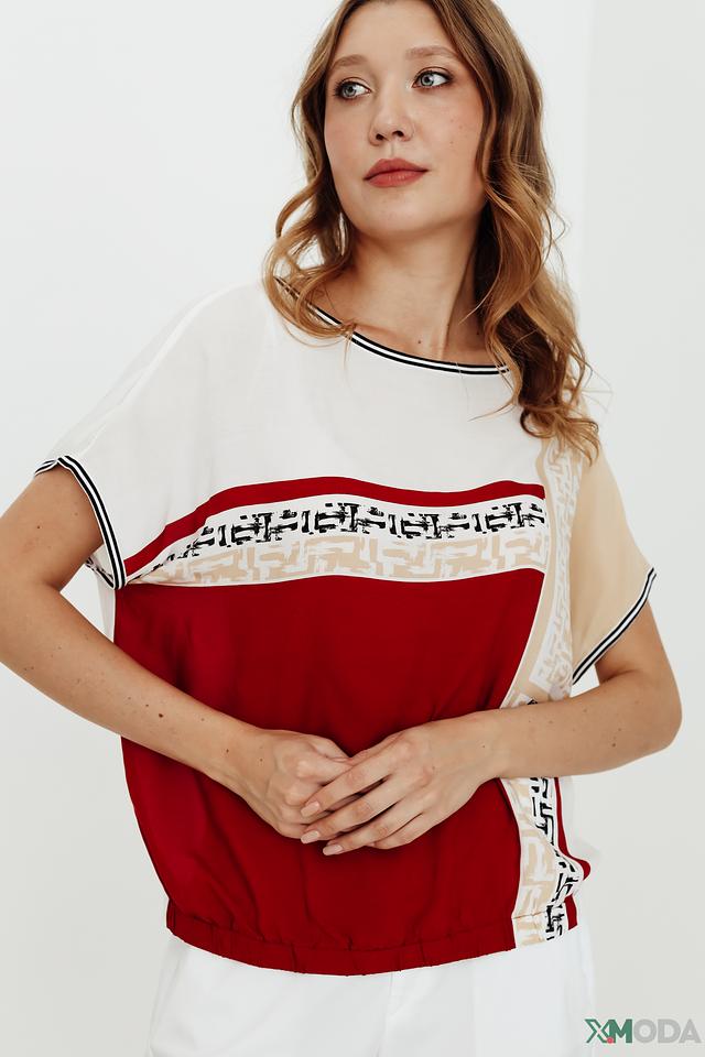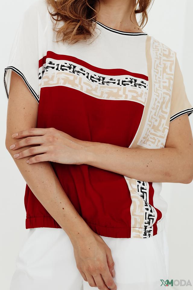 Красная блуза Gerry Weber с оригинальным геометрическим принтом и короткими рукавами. Модель выполнена из мягкой вискозы с добавлением эластана, обеспечивающего комфорт при носке. Состав: вискоза 92%, эластан 8%