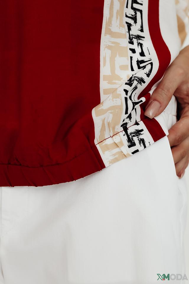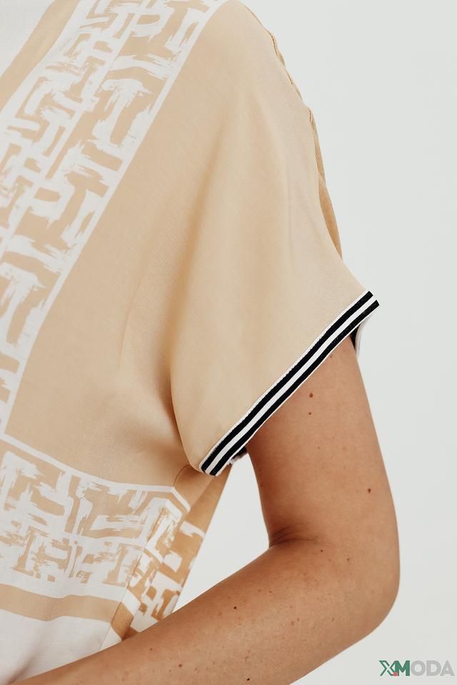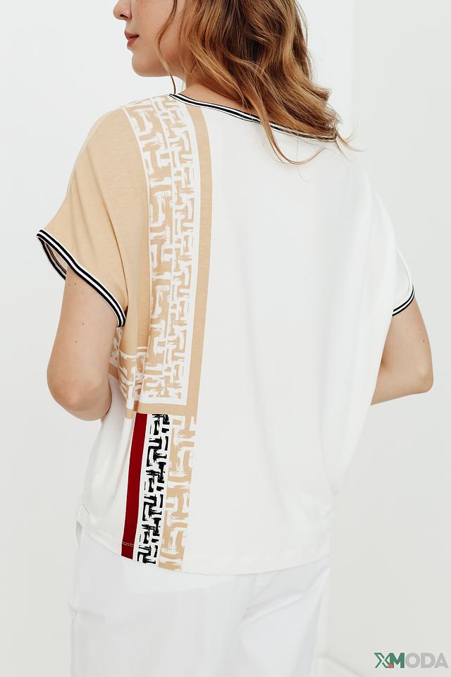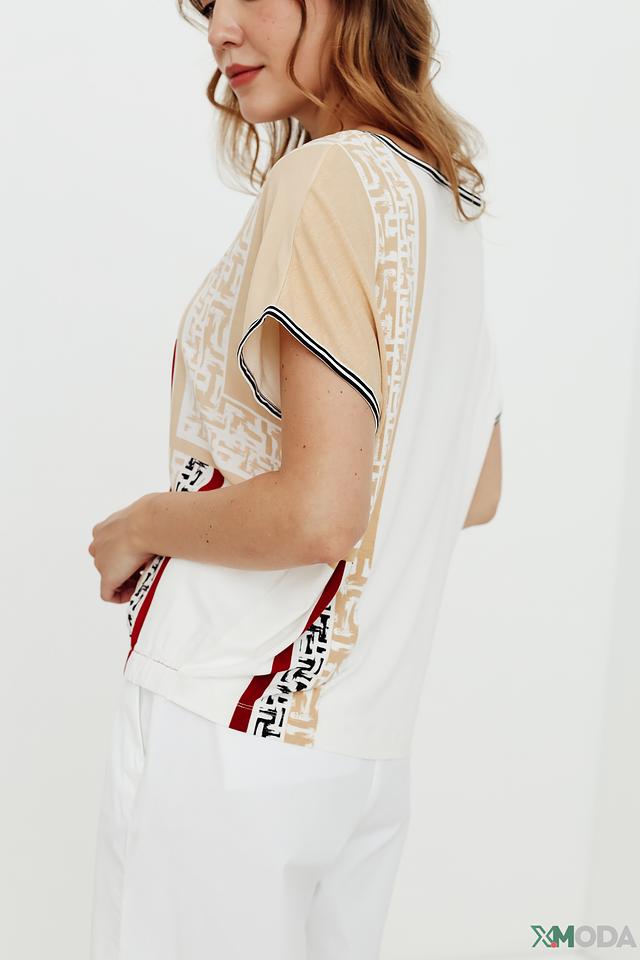 Блуза имеет свободный крой, короткие рукава и круглый вырез горловины. Декоративная белая полоса с принтом проходит по горловине и по краям рукавов, добавляя изюминку дизайну.