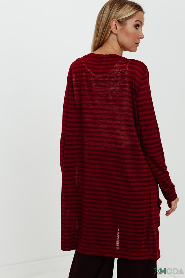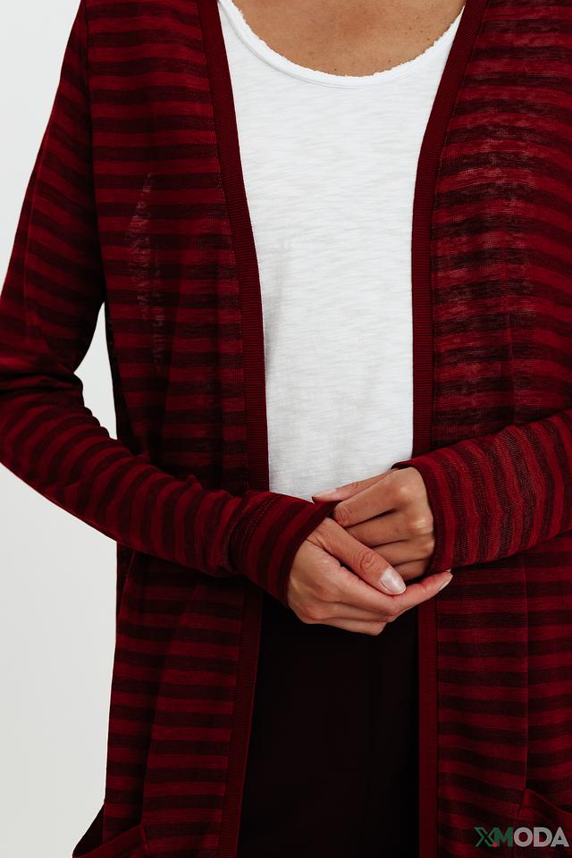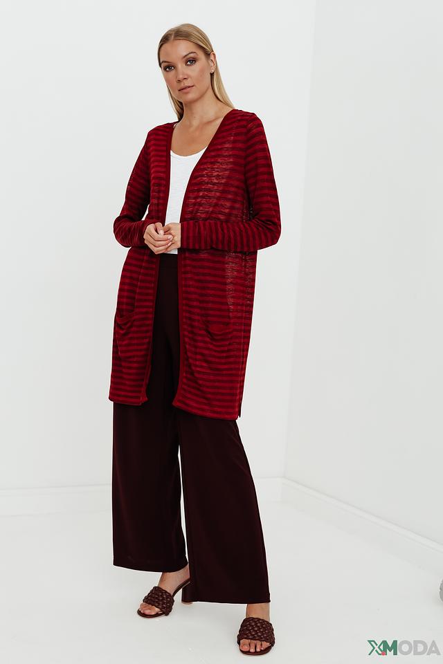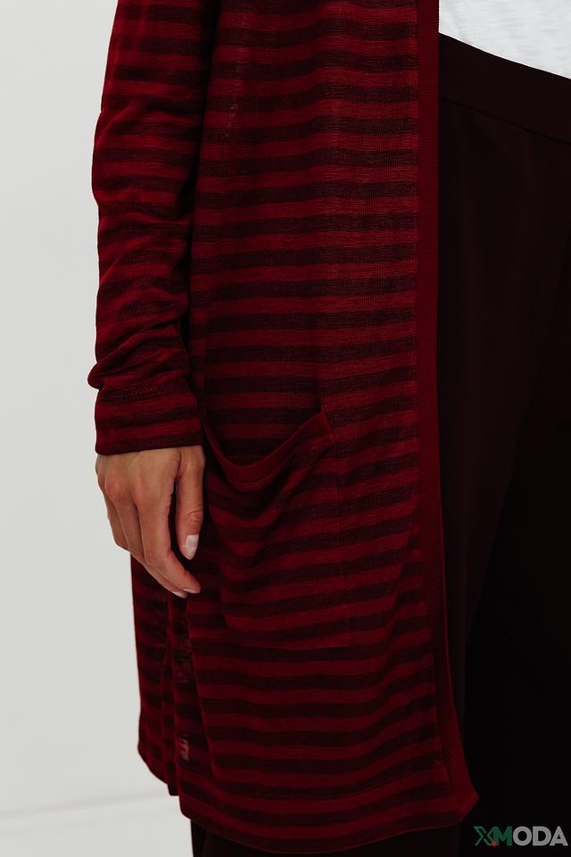 Особенностью модели является яркий бордовый цвет в сочетании с тонкими полосками. Наличие боковых карманов добавляет практичности и удобства. Этот кардиган станет незаменимой вещью в вашем гардеробе, позволяя создавать разнообразные стильные образы на каждый день.