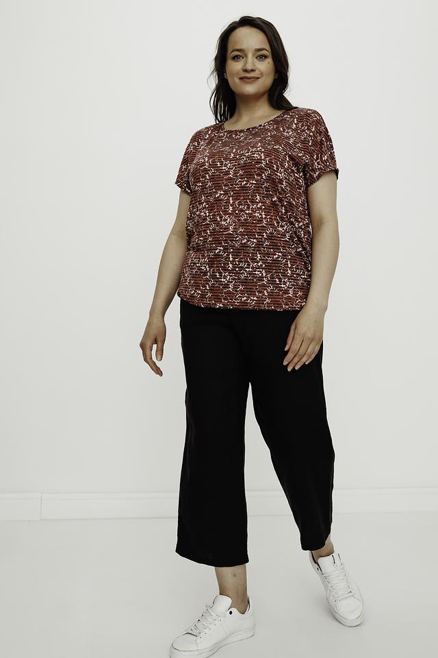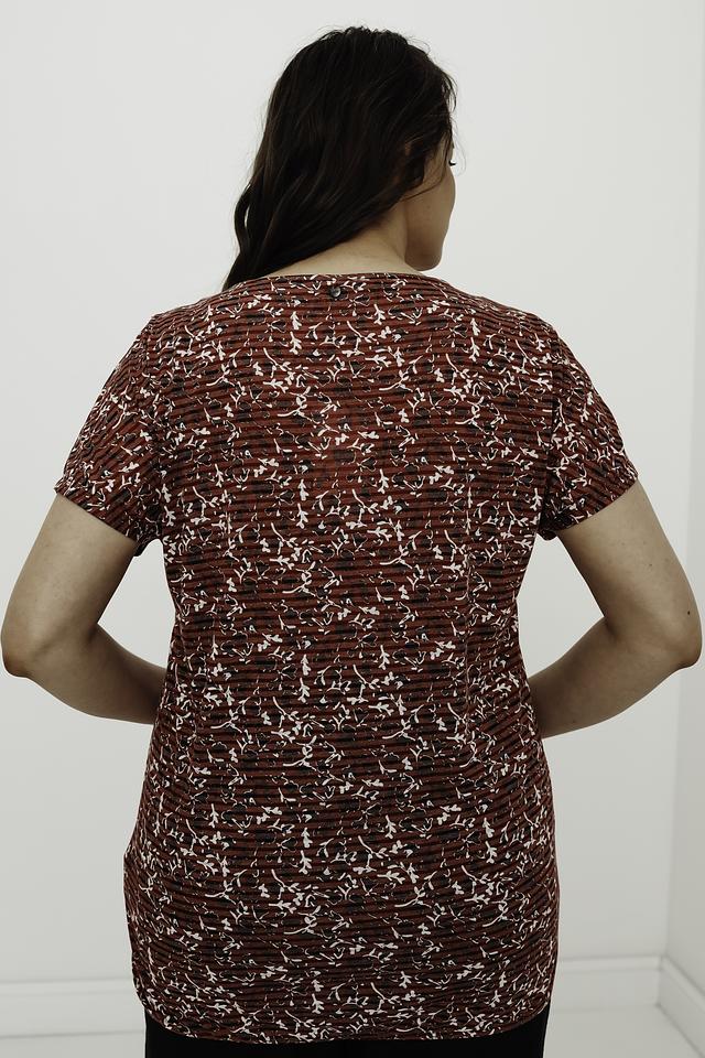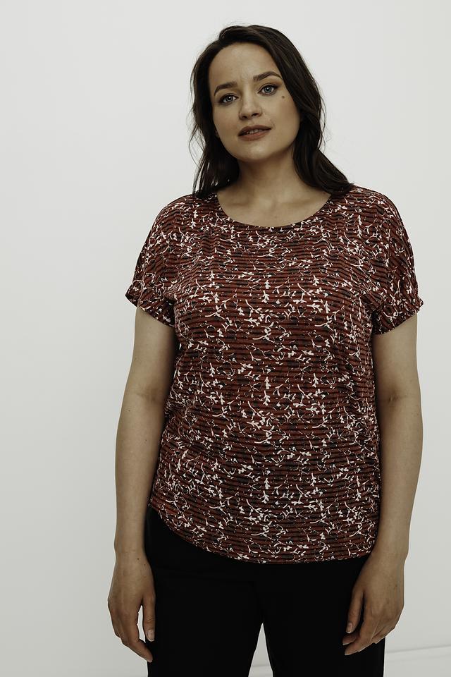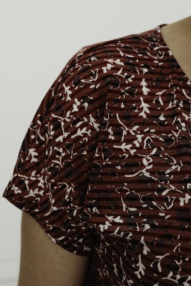 Особенностью данной модели является яркий цветочный принт на бордовом фоне, который придаёт ей женственности и очарования. Блуза прекрасно сочетается с брюками, юбками и джинсами, позволяя создавать разнообразные образы.