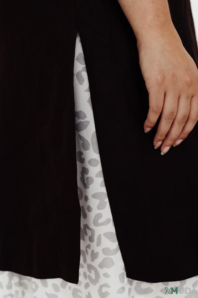 Жилет имеет удлинённый крой, который визуально вытягивает силуэт и делает образ более элегантным. V-образный вырез подчеркивает зону декольте.