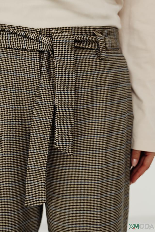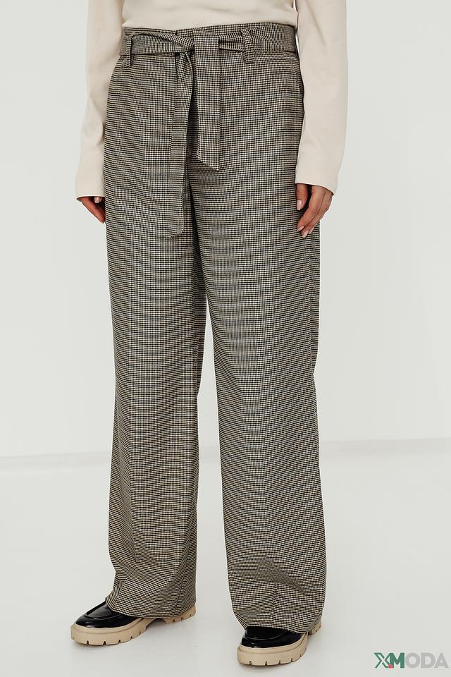 Брюки имеют прямой крой, который обеспечивает комфортную посадку и свободу движений. Пояс дополнен завязками, позволяющими регулировать облегание и подчеркивать талию. Изготовлены из смеси полиэстера, вискозы и эластана, что обеспечивает приятные тактильные ощущения и хорошую износостойкость.