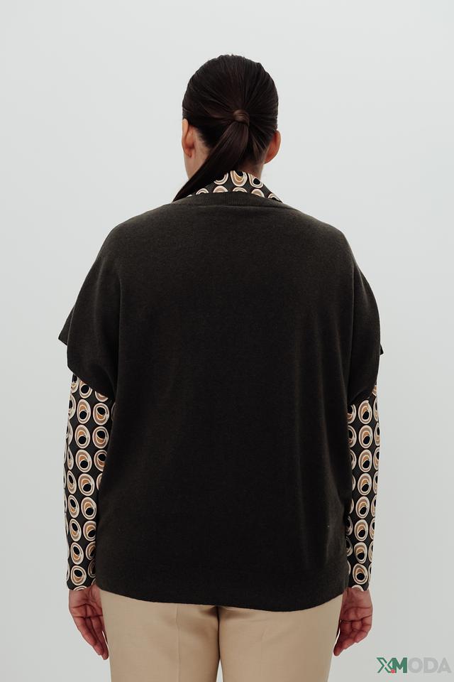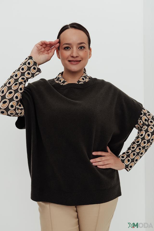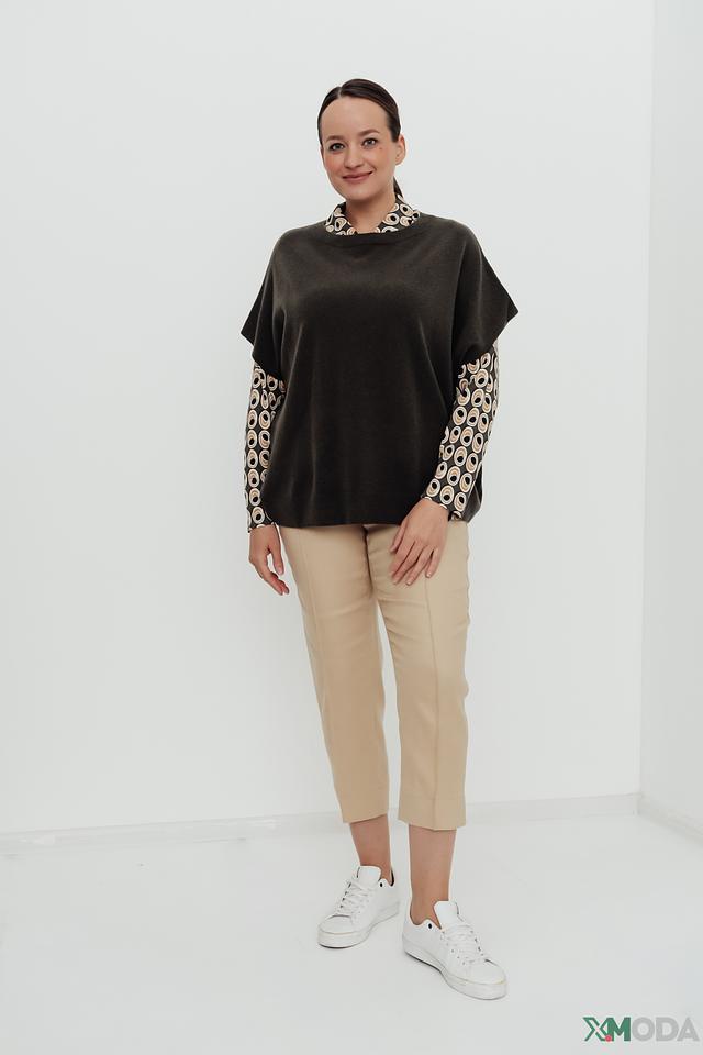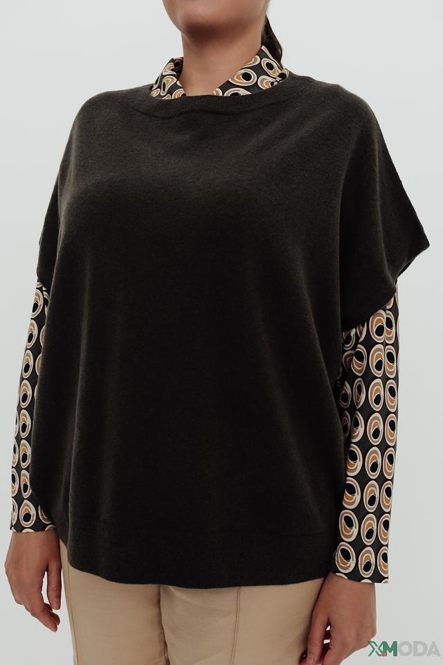 Модель имеет свободный крой оверсайз, который обеспечивает комфорт и свободу движений. Пуловер имеет округлый вырез горловины и короткие рукава-крылышки, что делает его идеальным для теплой погоды или для ношения поверх другой одежды.