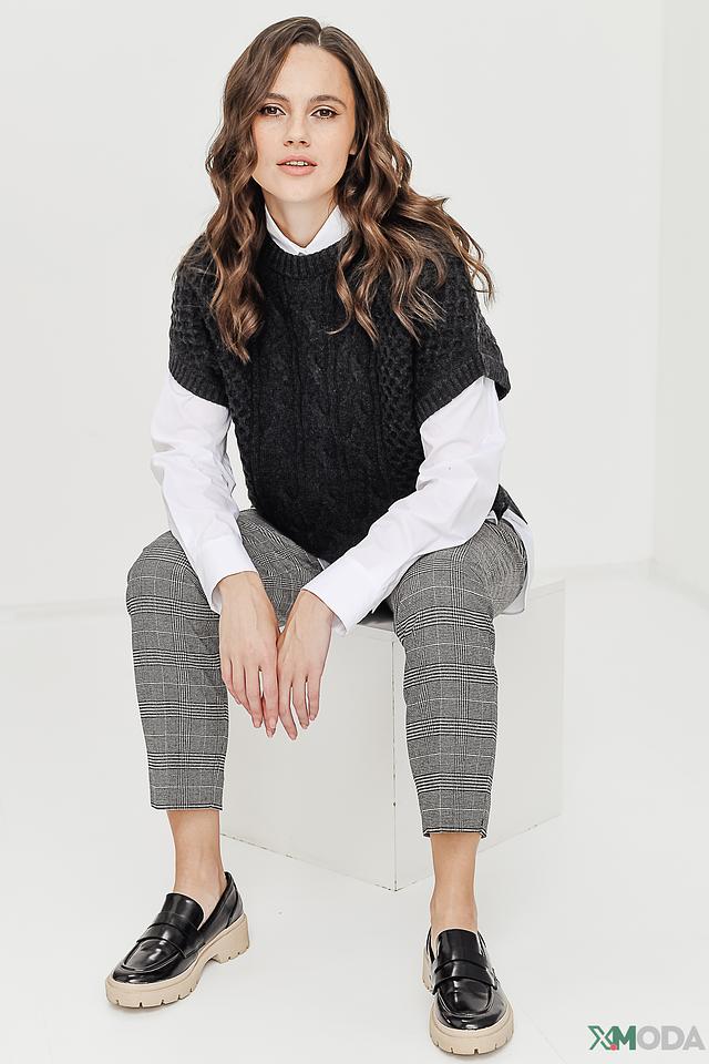 Жилет имеет свободный крой, который обеспечивает комфорт в носке. Текстура вязания с косами добавляет изделию объём и визуальный интерес. Состав ткани включает полиамид, вискозу, шерсть и хлопок, что обеспечивает мягкость, тепло и износостойкость.