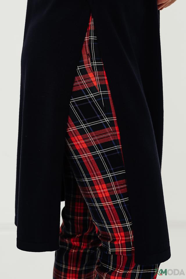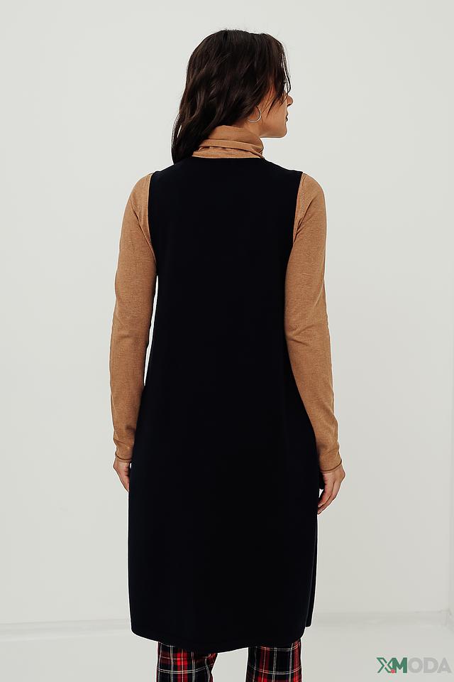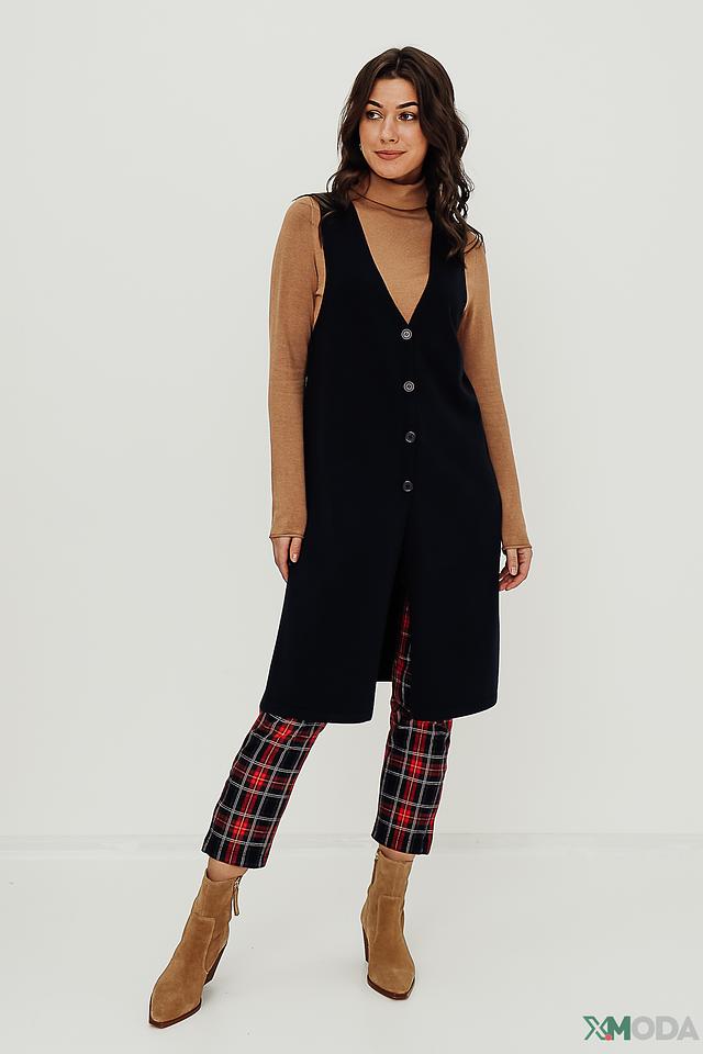 Жилет имеет удлиненный крой, который визуально вытягивает силуэт и обеспечивает дополнительное тепло. V-образный вырез подчеркивает линию шеи, а застежка на пуговицы позволяет регулировать степень прилегания. Оригинальным элементом дизайна является вставка из ткани в красную клетку, расположенная по бокам изделия.