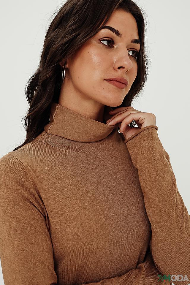 Модель имеет классический крой с длинными рукавами и высоким воротом, который визуально удлиняет шею и придает образу элегантность. Водолазка плотно прилегает к фигуре, подчеркивая ее достоинства, но не сковывает движений.